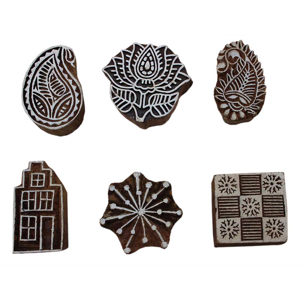Set of 6 Piece New Mix Wooden Printing Block. Ideal for Using on Fabric, Paper, Canvas, etc. These Blocks can be use to Print with Oil Colors, Fabric Colors, Water Colors, Acrylic Colors and Vegetable Colors.
