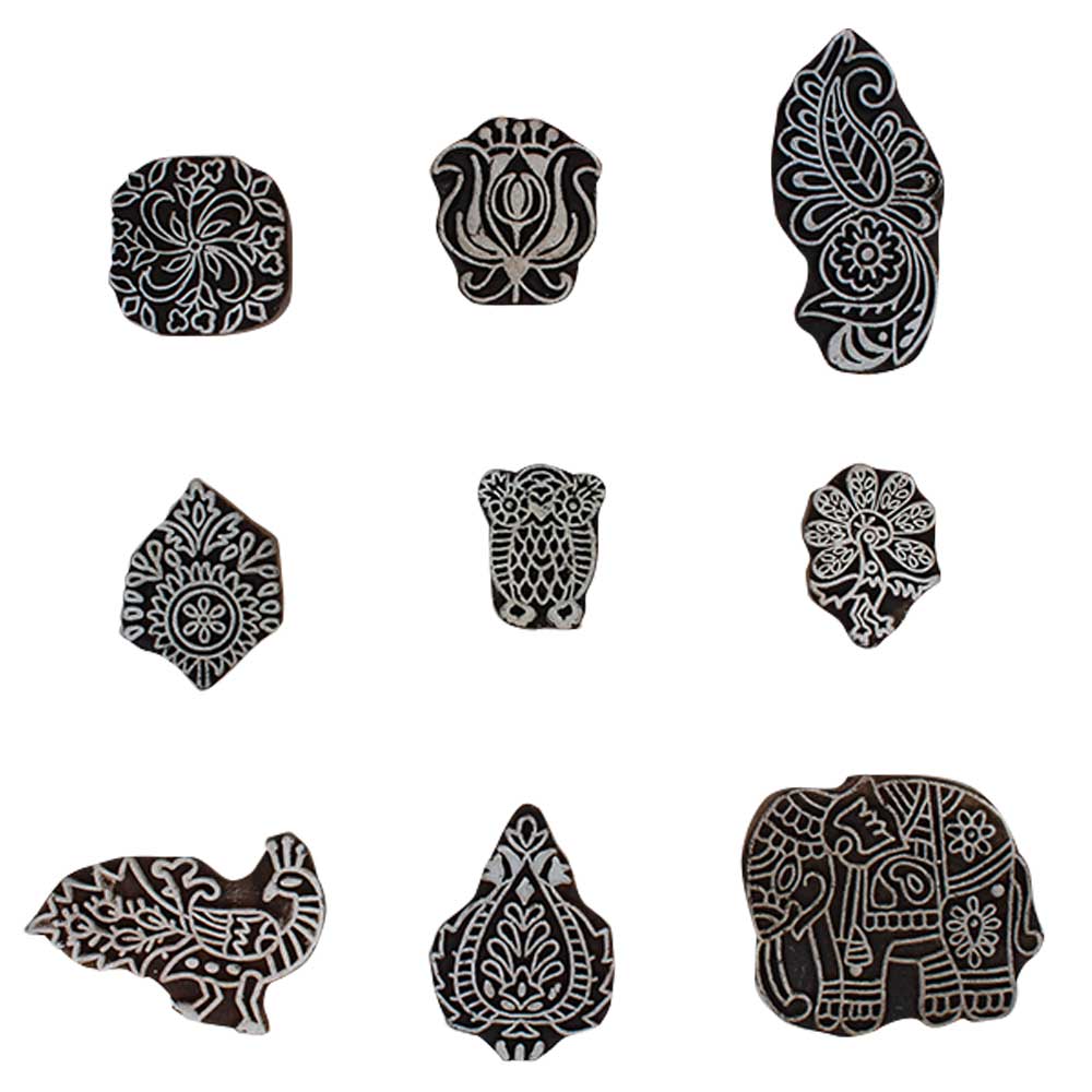 Set of 9 Piece New Mix Wooden Printing Block. Ideal for Using on Fabric, Paper, Canvas, etc. These Blocks can be use to Print with Oil Colors, Fabric Colors, Water Colors, Acrylic Colors and Vegetable Colors.