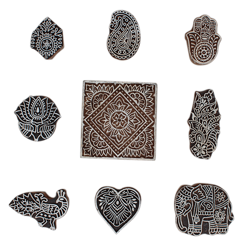 Set of 9 Piece New Mix Wooden Printing Block. Ideal for Using on Fabric, Paper, Canvas, etc. These Blocks can be use to Print with Oil Colors, Fabric Colors, Water Colors, Acrylic Colors and Vegetable Colors.