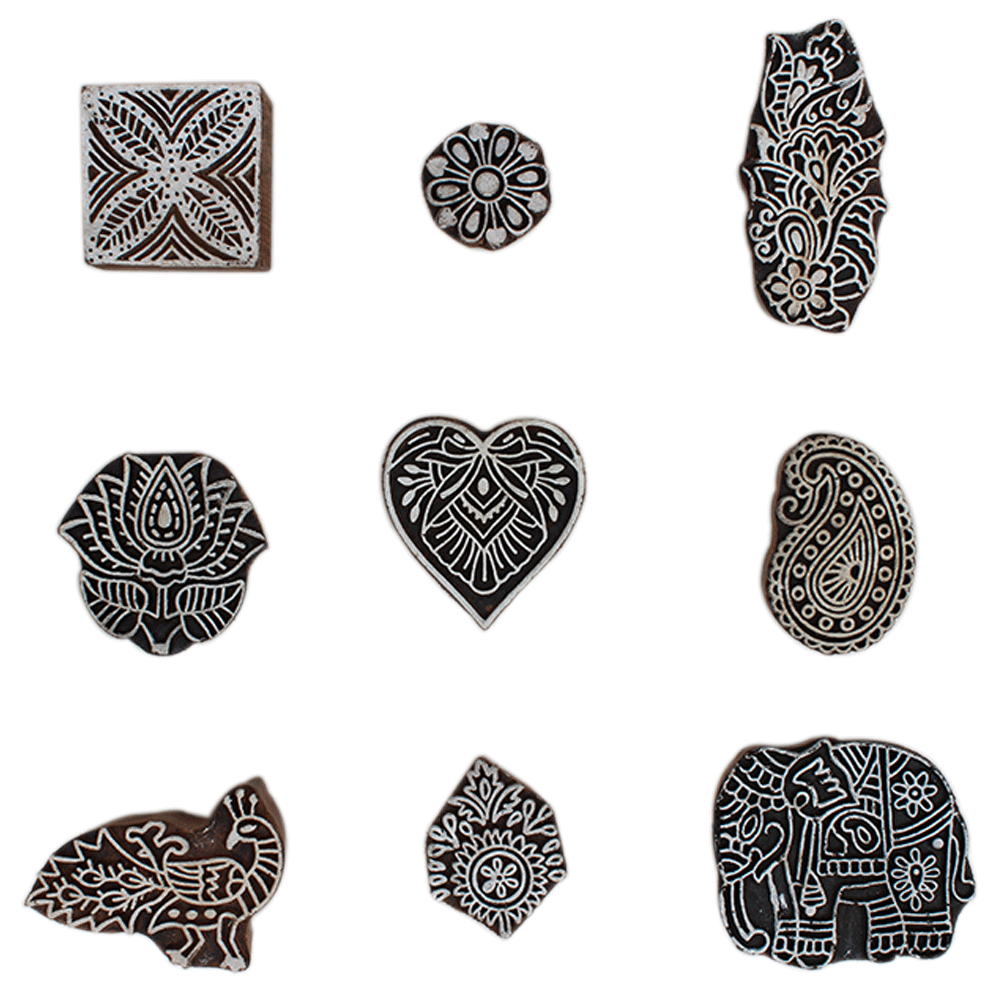 Set of 9 Piece New Mix Wooden Printing Block. Ideal for Using on Fabric, Paper, Canvas, etc. These Blocks can be use to Print with Oil Colors, Fabric Colors, Water Colors, Acrylic Colors and Vegetable Colors.