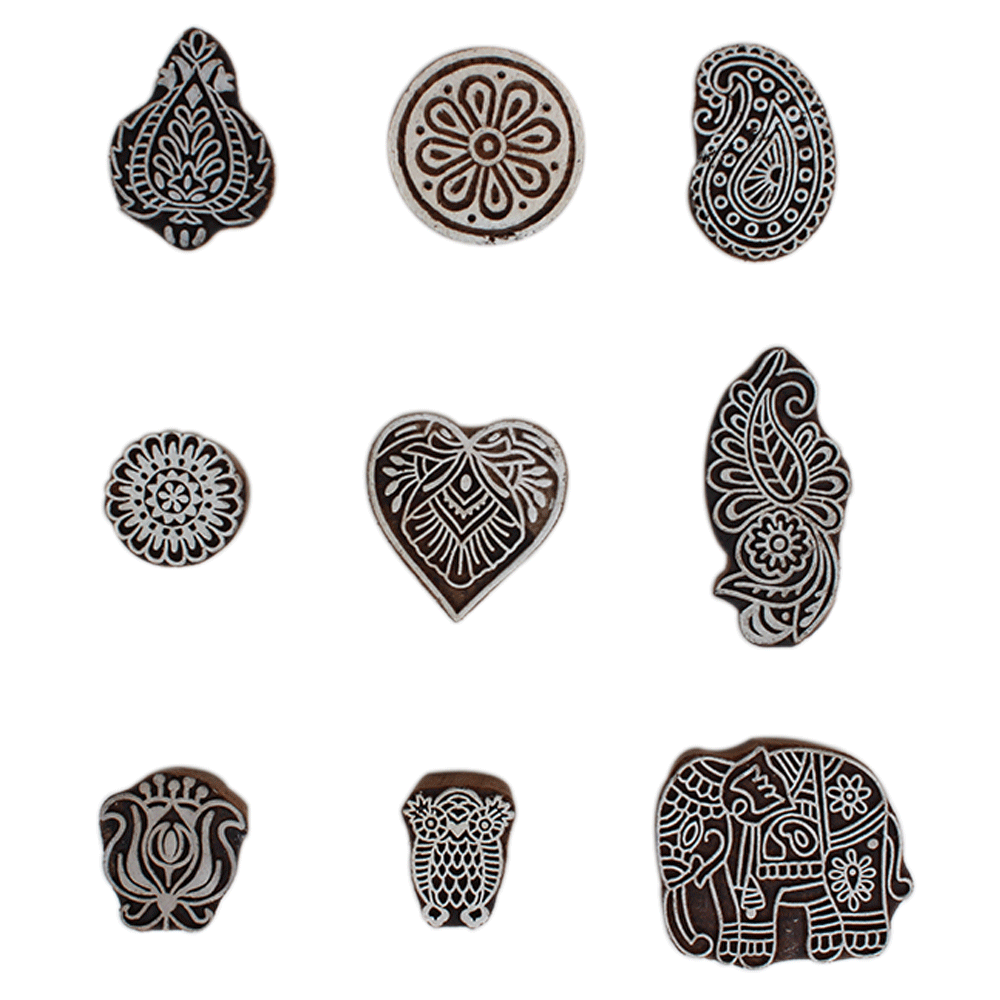 Set of 9 Piece New Mix Wooden Printing Block. Ideal for Using on Fabric, Paper, Canvas, etc. These Blocks can be use to Print with Oil Colors, Fabric Colors, Water Colors, Acrylic Colors and Vegetable Colors.