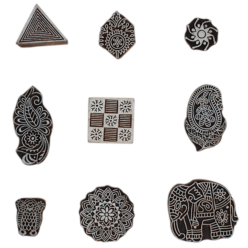 Set of 9 Piece New Mix Wooden Printing Block. Ideal for Using on Fabric, Paper, Canvas, etc. These Blocks can be use to Print with Oil Colors, Fabric Colors, Water Colors, Acrylic Colors and Vegetable Colors.