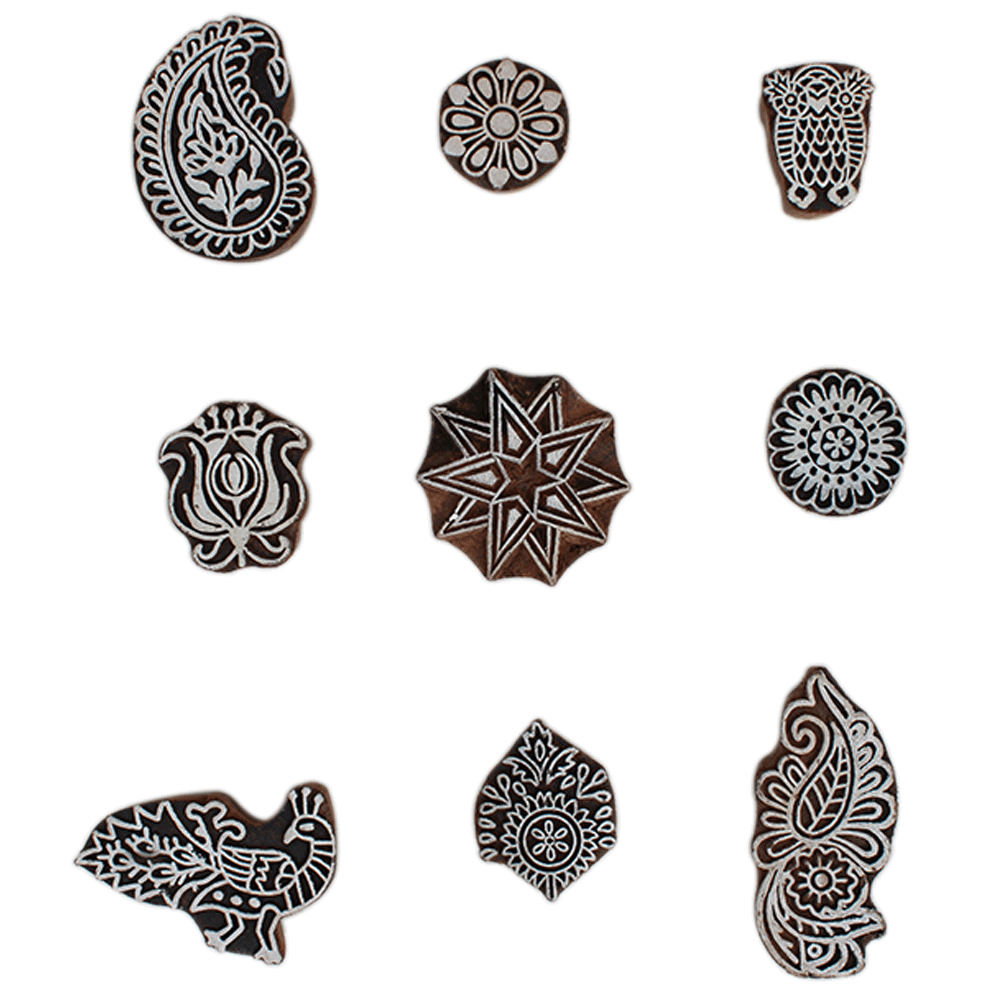 Set of 9 Piece New Mix Wooden Printing Block. Ideal for Using on Fabric, Paper, Canvas, etc. These Blocks can be use to Print with Oil Colors, Fabric Colors, Water Colors, Acrylic Colors and Vegetable Colors.