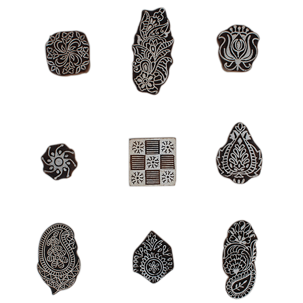 Set of 9 Piece New Mix Wooden Printing Block. Ideal for Using on Fabric, Paper, Canvas, etc. These Blocks can be use to Print with Oil Colors, Fabric Colors, Water Colors, Acrylic Colors and Vegetable Colors.