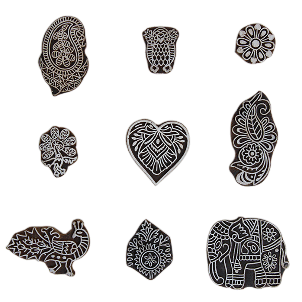 Set of 9 Piece New Mix Wooden Printing Block. Ideal for Using on Fabric, Paper, Canvas, etc. These Blocks can be use to Print with Oil Colors, Fabric Colors, Water Colors, Acrylic Colors and Vegetable Colors.