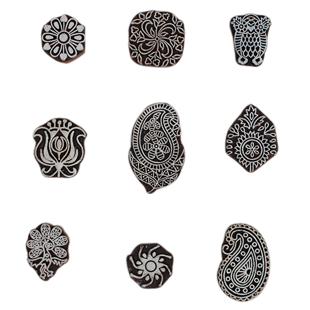 Set of 9 Piece New Mix Wooden Printing Block. Ideal for Using on Fabric, Paper, Canvas, etc. These Blocks can be use to Print with Oil Colors, Fabric Colors, Water Colors, Acrylic Colors and Vegetable Colors.