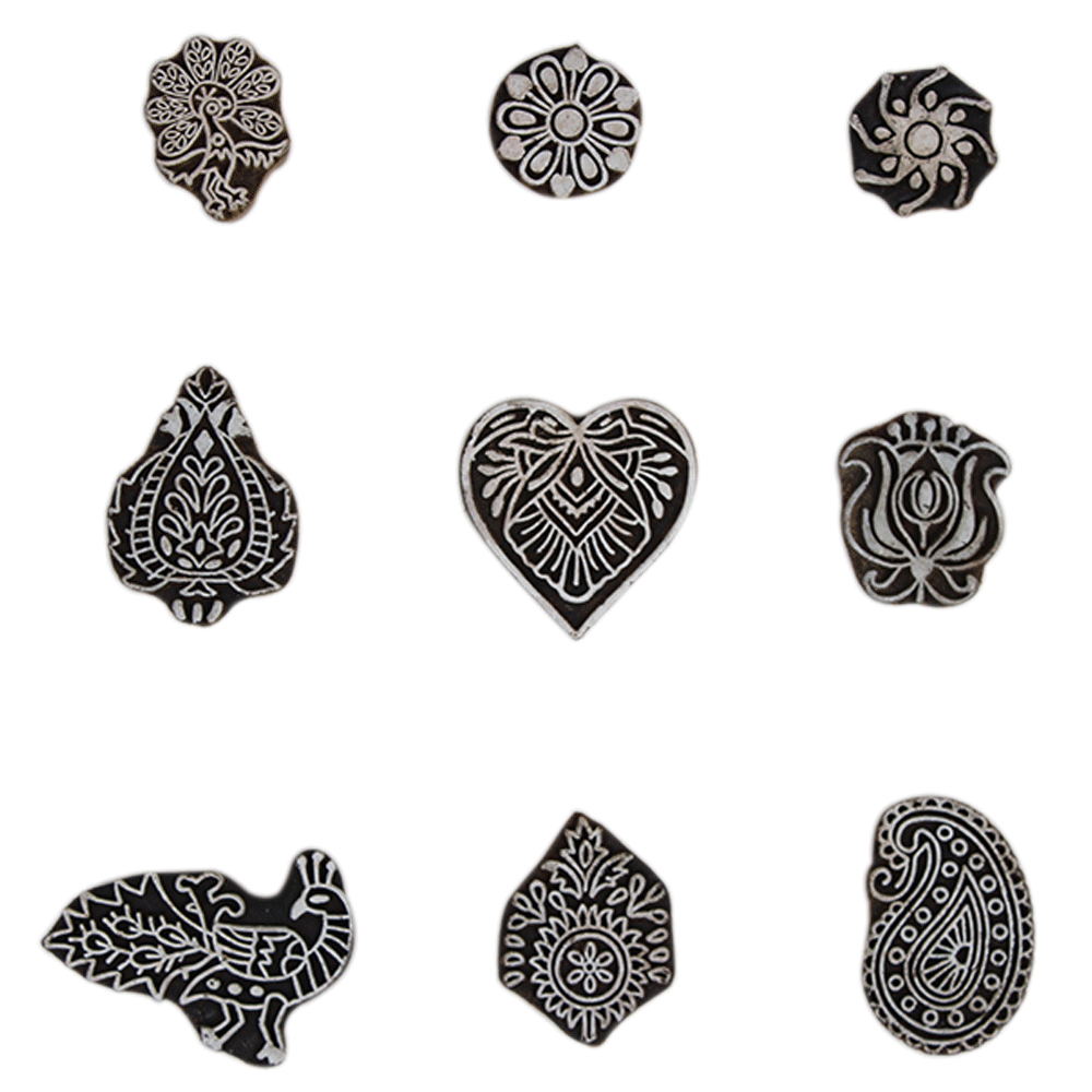 Set of 9 Piece New Mix Wooden Printing Block. Ideal for Using on Fabric, Paper, Canvas, etc. These Blocks can be use to Print with Oil Colors, Fabric Colors, Water Colors, Acrylic Colors and Vegetable Colors.