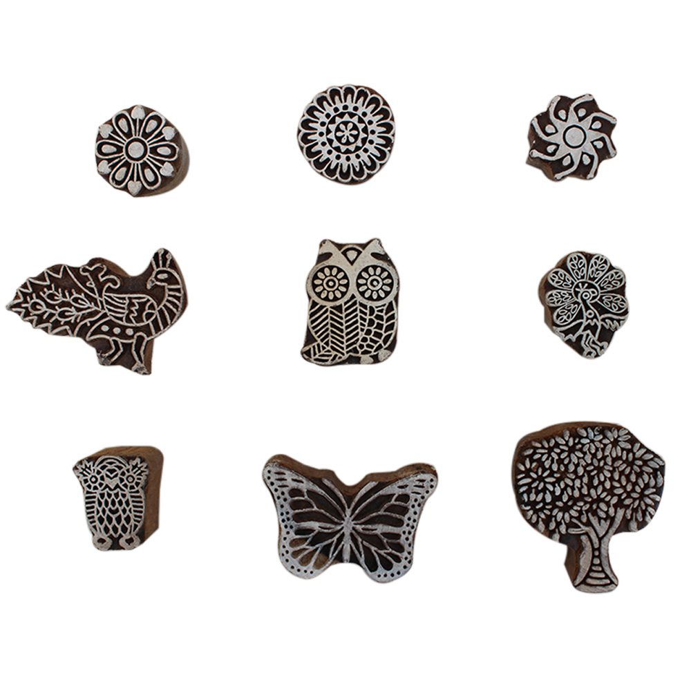 Set of 9 Piece New Mix Wooden Printing Block. Ideal for Using on Fabric, Paper, Canvas, etc. These Blocks can be use to Print with Oil Colors, Fabric Colors, Water Colors, Acrylic Colors and Vegetable Colors.