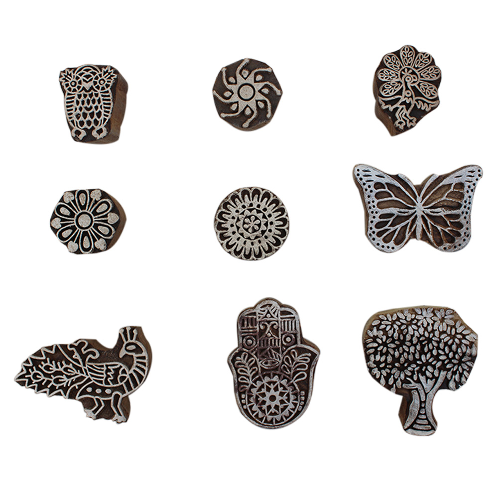 Set of 9 Piece New Mix Wooden Printing Block. Ideal for Using on Fabric, Paper, Canvas, etc. These Blocks can be use to Print with Oil Colors, Fabric Colors, Water Colors, Acrylic Colors and Vegetable Colors.