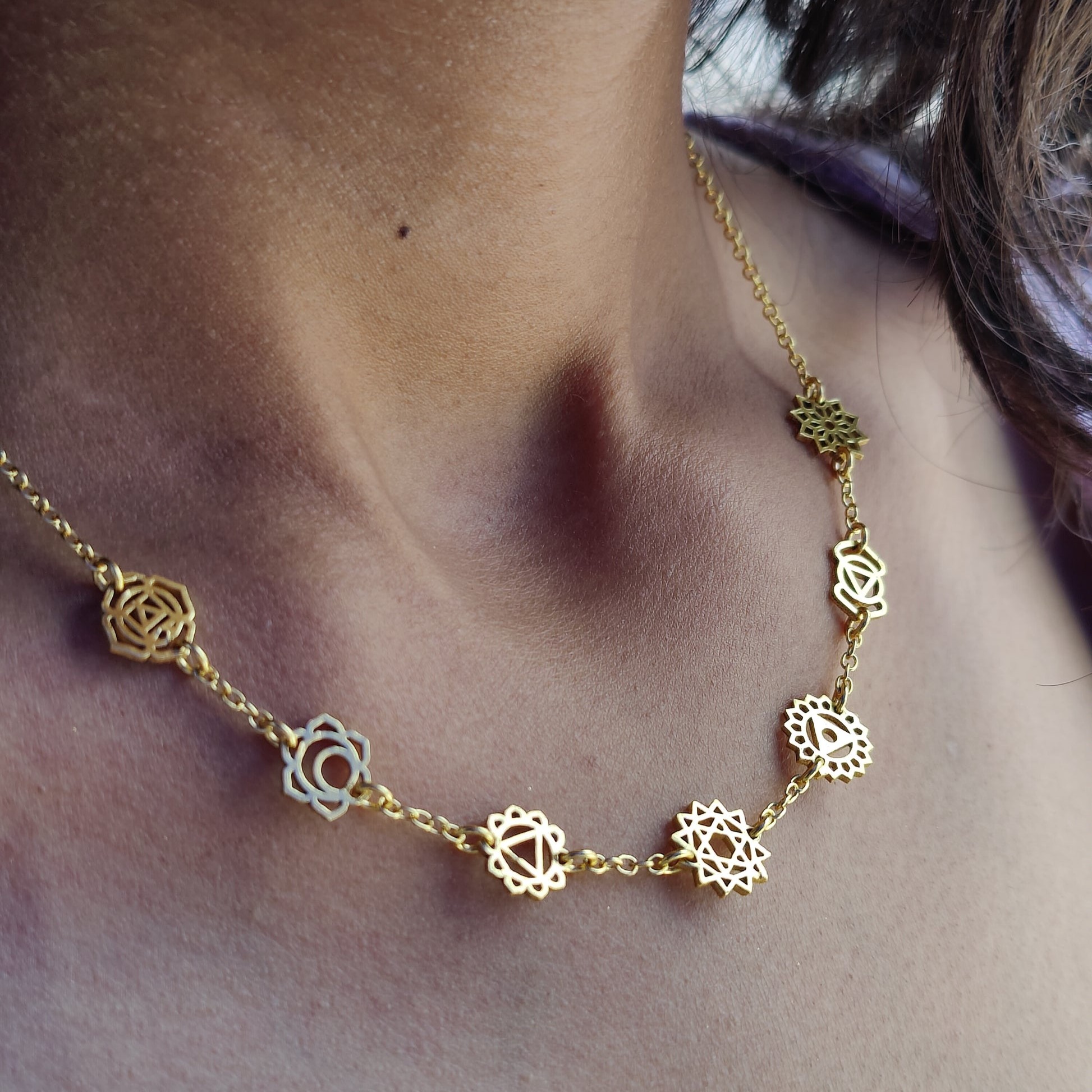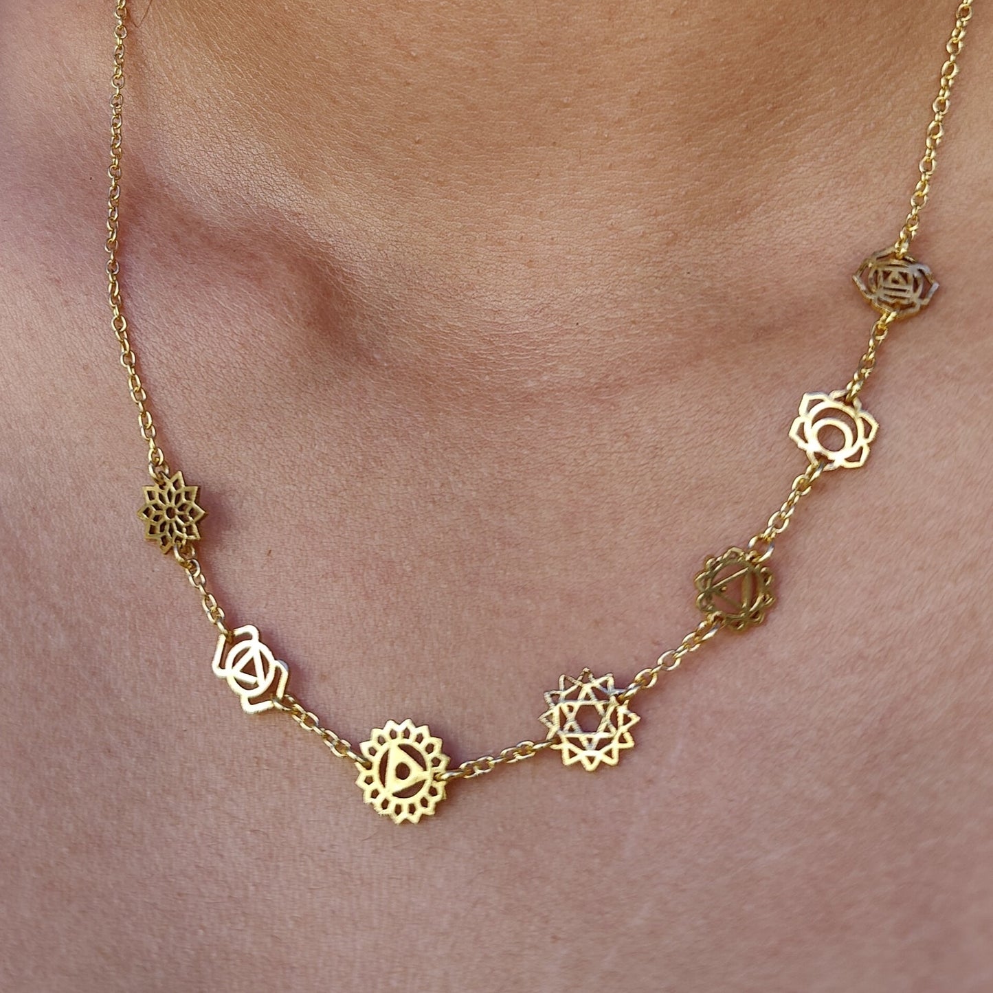 This Seven Chakra Charms Necklace brings together ancient symbolism and modern handcrafted beauty in a delicate, wearable form. Made from solid brass and finished in a radiant 18K gold plating, the necklace features seven thoughtfully designed chakra charms that represent alignment, harmony, and mindful living. At 18 inches, it rests gracefully at the collarbone—perfect for women who appreciate meaningful jewelry infused with spiritual depth and artisan craftsmanship. Lightweight, refined, and consciously made, it enhances everyday style with soulful elegance.