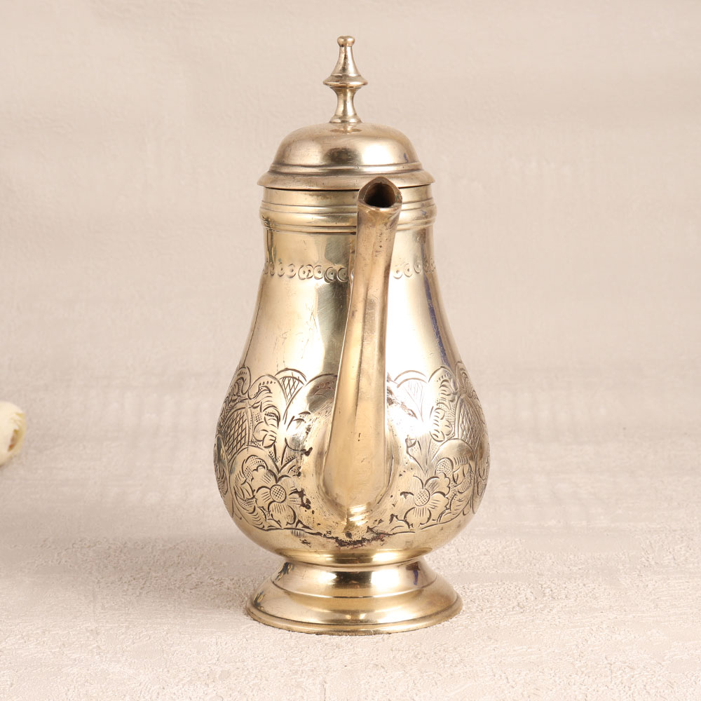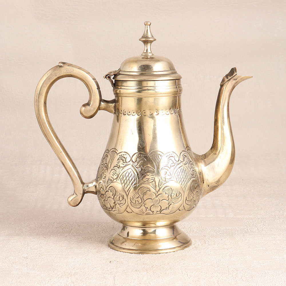 Adorn your home interior with this exquisite white Brass tea kettle that is a true masterpiece of craftsmanship. Handcrafted by highly skilled Indian artisans using traditional English Art techniques, this stunning piece is a testament to their expertise and dedication. Its gleaming golden finish adds a touch of opulence to any setting, making it a versatile choice for your home, office, hotel, cafe, shop, or restaurant. This tea kettle is not just a functional kitchen accessory, it's a work of art. Its intricate engraving, elegant handle, spout, and lid combine to create a captivating vintage design that evokes a sense of nostalgia and charm. However, we recommend using it solely for decoration due to its vintage nature, preserving its beauty for years to come. It's a valuable addition to any vintage collection and is perfect for display at exhibitions. This tea kettle also makes a thoughtful gift for your family, friends or relatives on special, festive, or auspicious occasions, sharing the elegance and heritage of Indian craftsmanship.
