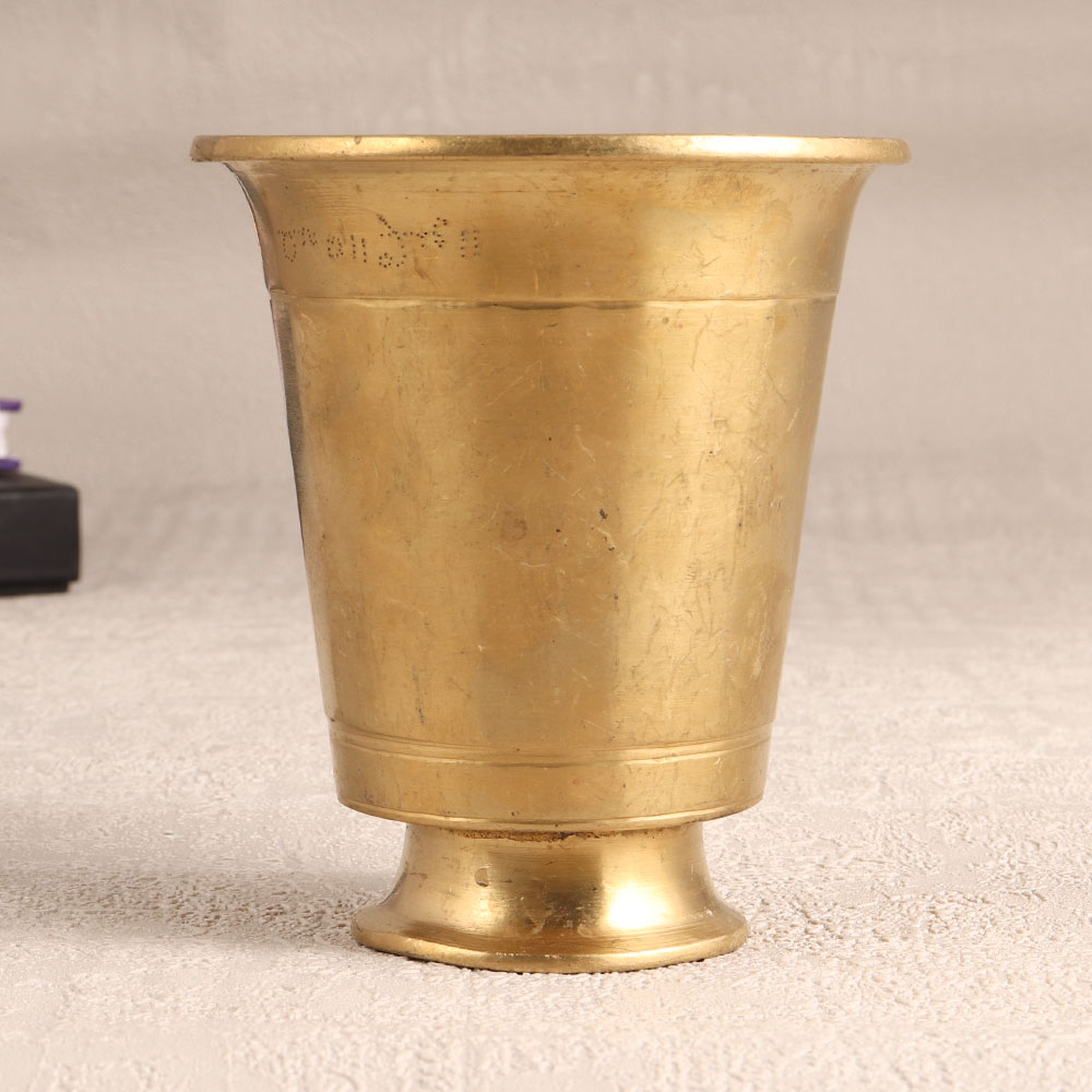Immerse yourself in the timeless elegance of this Vintage Brass Holy Water Glass that is crafted with precision and devotion by highly talented Indian craftsmen in the rich tradition of South Indian Art. This magnificent piece exudes an air of antiquity, boasting a lustrous brown finish that mirrors the passage of time, making it a charming addition to your collection of vintage treasures. Handcrafted from premium brass, this holy water glass is not only a testament to superior craftsmanship but also a vessel of spiritual significance. Use it during prayer, havan, or various rituals to hold holy water, adding a sacred touch to your religious ceremonies. Its versatility is unmatched, as it can grace any setting, be it your home, office, restaurant, hotel, or cafe's prayer room. Furthermore, its aesthetic allure makes it an ideal choice for floral decorations, infusing beauty and spirituality into your space. Whether for yourself or as a thoughtful gift, this Vintage Brass Holy Water Glass is perfect for special, festive, or auspicious occasions.