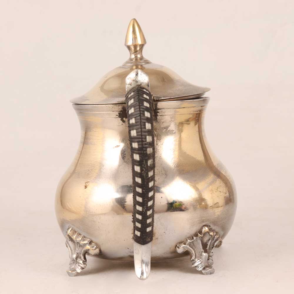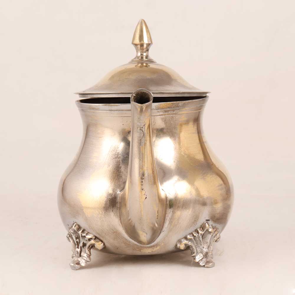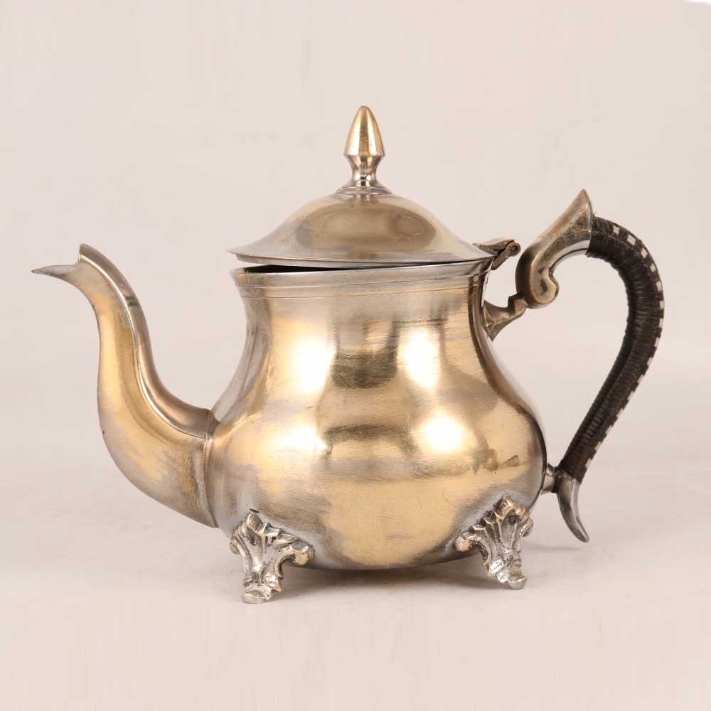 This Vintage Brass Kettle is a delightful fusion of functionality and aesthetic appeal that exudes timeless elegance. This extraordinary piece features a tastefully designed lid and a gracefully curved spout, perfectly complemented by four designer legs that add a touch of sophistication and stability when placed on any surface. Handcrafted with utmost care and precision, this kettle is crafted from finest-quality brass, ensuring durability and longevity. Its glossy golden and silver finish adds a luxurious sheen to any setting, making it a captivating centerpiece wherever it resides. Originally used for steeping tea, this kettle has gracefully aged with time, making it unsuitable for cooking purposes. However, it remains a delightful collectible for tea enthusiasts and admirers of English Art. Ideal for display in homes, offices, restaurants, hotels, or cafes, it instantly adds a touch of vintage charm to any space. Whether showcased at exhibitions or included in a cherished vintage collection, this kettle holds nostalgic value and makes for a thoughtful and cherished gift for family, friends or relatives on special, festive, or auspicious occasions.