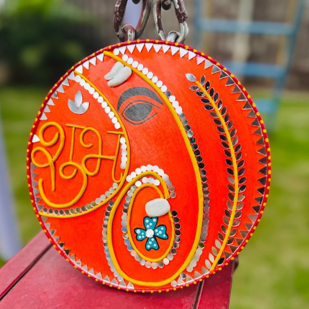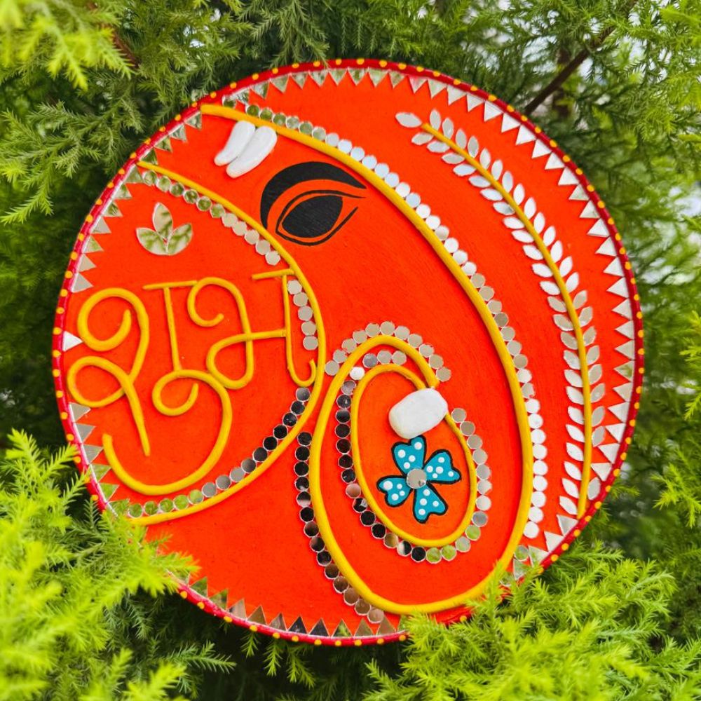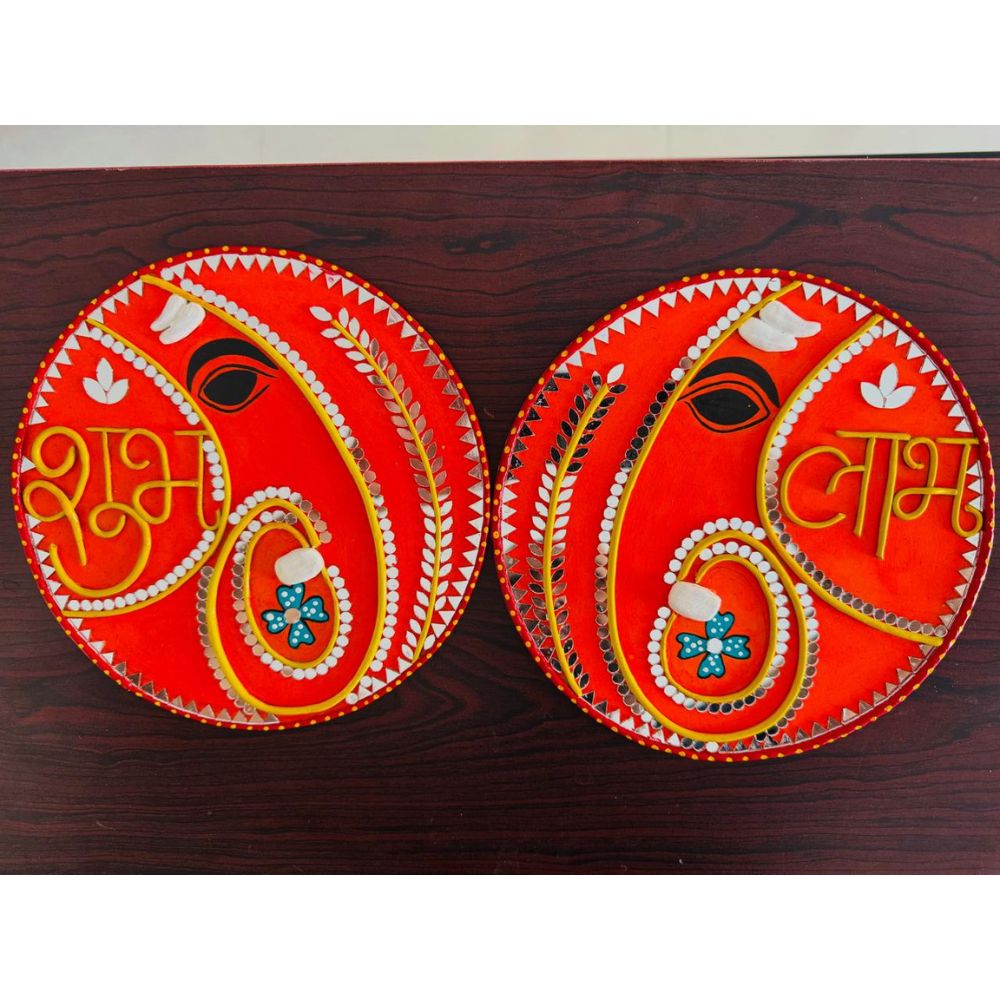 This Shubh Laabh Lippan art piece is a beautiful representation of auspiciousness and prosperity. The intricate design and earthy tones bring a sense of warmth and positivity to any space. This art piece is ideal for Diwali celebrations, puja purposes, or as a welcoming decor for your entrance. It sets a positive tone and invites good fortune into your home. This comes in pair and the size of each round MDF Base is 8 inches.
