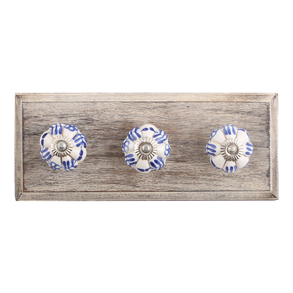 Silhouetted Blue Ceramic Wooden Hook. A Perfect Complement to the Soft Tone of the Wood are these White Traditional Hat Coat Hook Made of Genuine Porcelain and Brass. It can be use to Hang Jewellery, Leashes, Towels, Scarves, Light Weight Sweaters, Caps Etc.