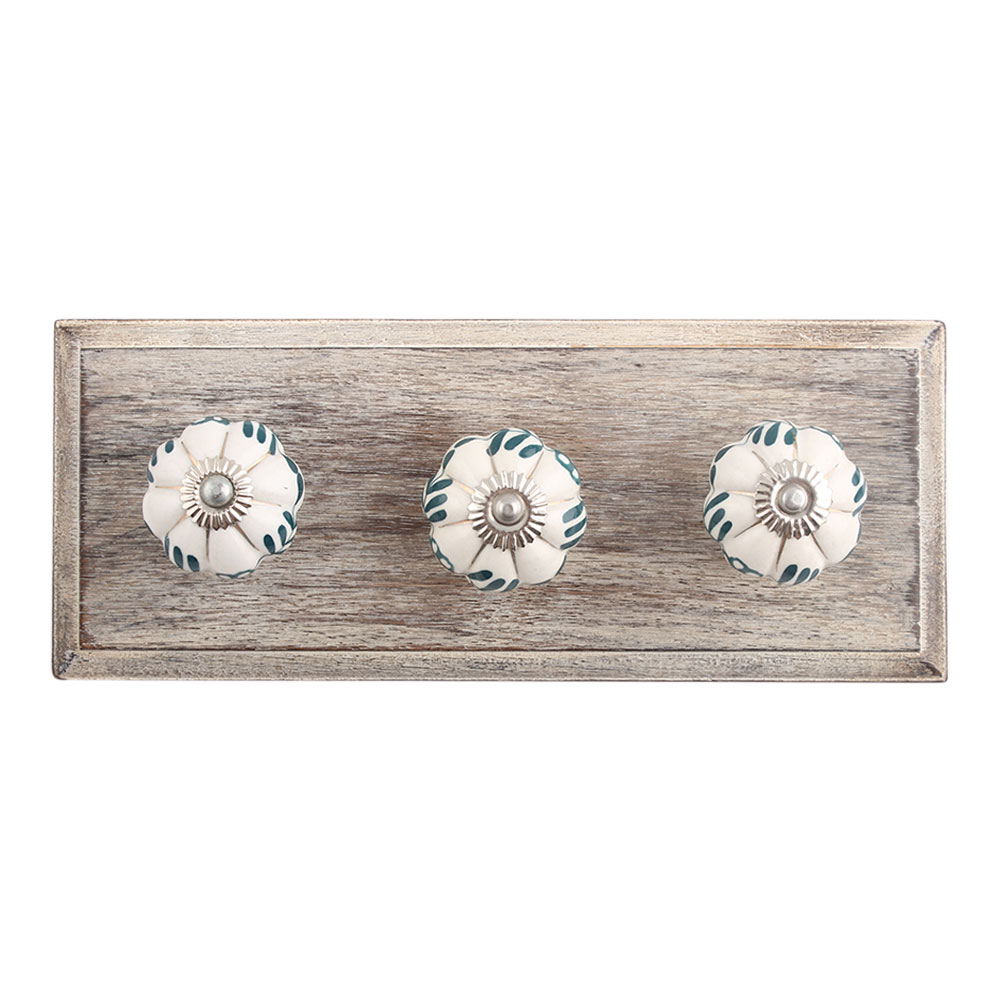 Silhouetted Green Knob Wooden Hook. A Perfect Complement to the Soft Tone of the Wood are these White Traditional Hat Coat Hook Made of Genuine Porcelain and Brass. It can be use to Hang Jewellery, Leashes, Towels, Scarves, Light Weight Sweaters, Caps Etc.