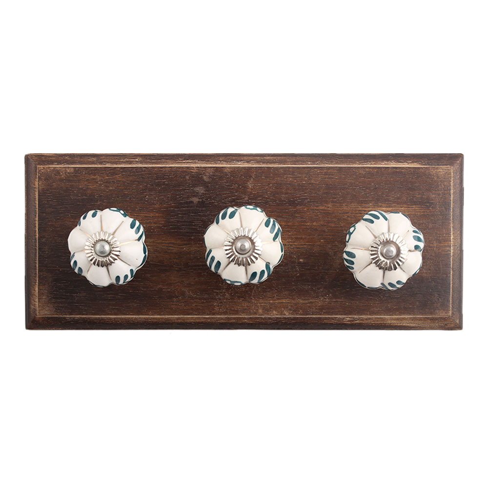 Silhouetted Green Knob Wooden Hook. A Perfect Complement to the Soft Tone of the Wood are these White Traditional Hat Coat Hook Made of Genuine Porcelain and Brass. It can be use to Hang Jewellery, Leashes, Towels, Scarves, Light Weight Sweaters, Caps Etc.