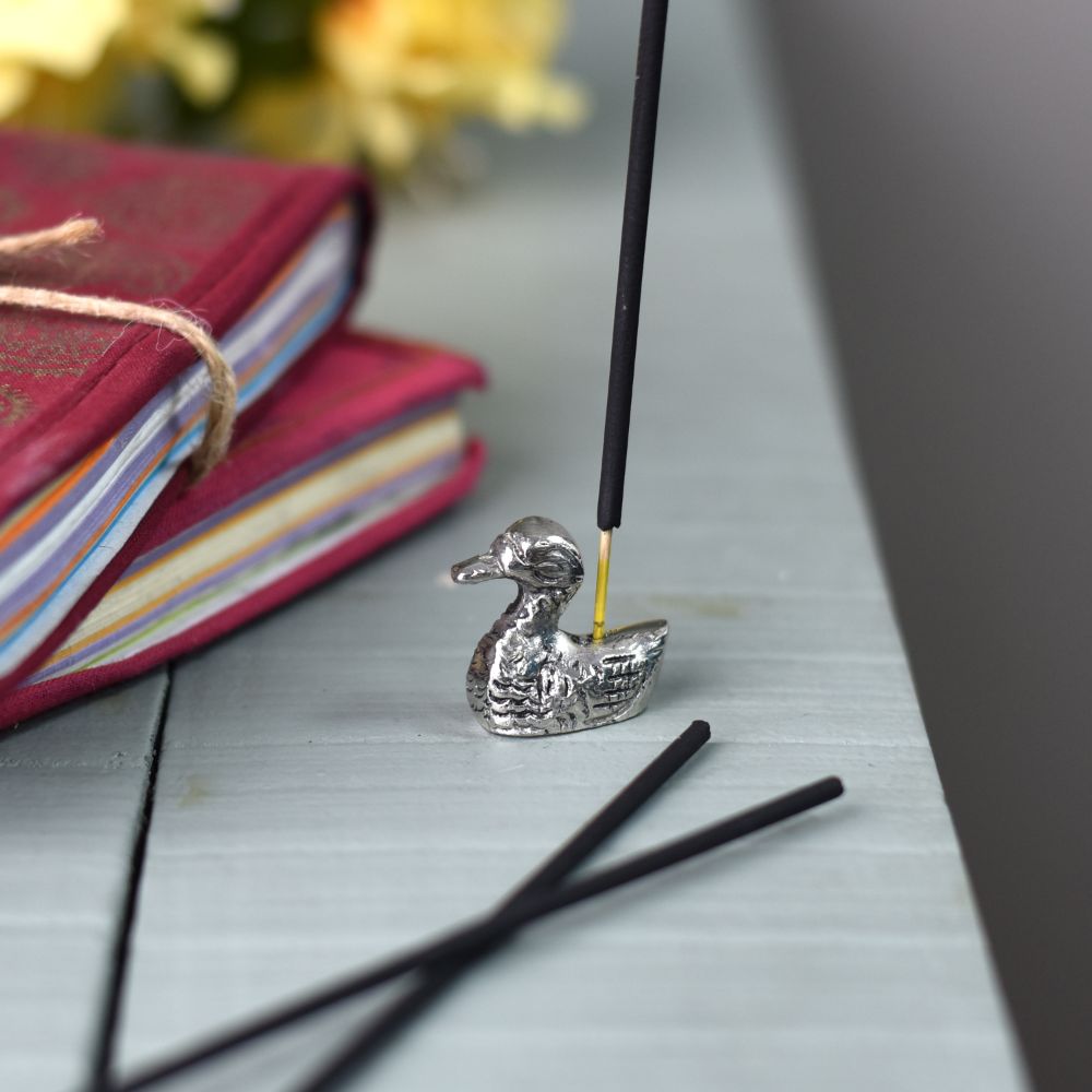 Very attractive and striking brass Duck statue for a Temple with an Incense holder. It raises a building's interior design value, whether it be a house, office, hotel, etc. An excellent present for birthdays, house warming's, shop openings, parents' days, Mother's Day, wedding return gifts, and festive occasions like Diwali and Grah pravesh. The finish is an aged silver.