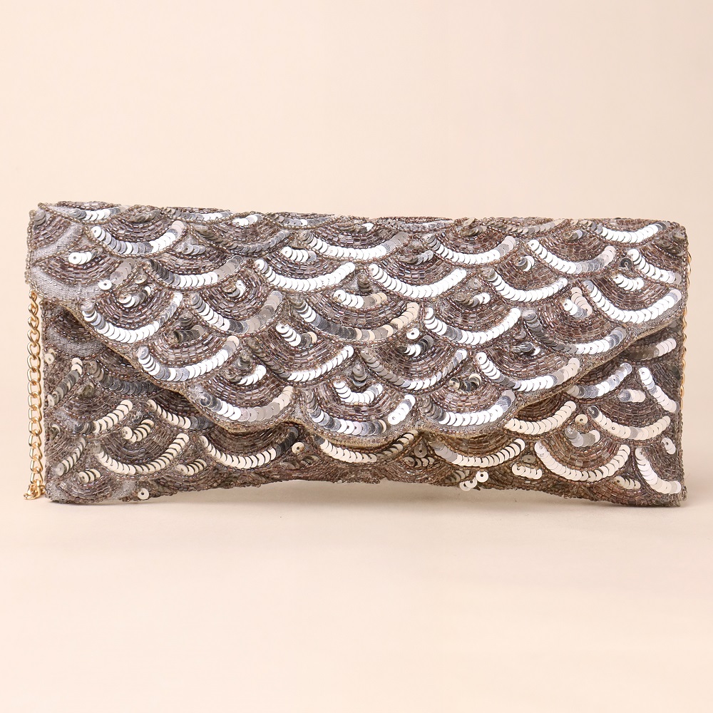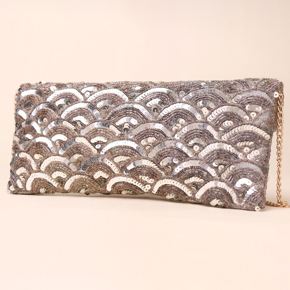 Add a touch of timeless glamour with this exquisite hand-embroidered sling bag featuring cascading sequin patterns in shimmering silver tones. The elegant scalloped design catches the light beautifully, making it the perfect accessory for evening events, weddings, and festive celebrations. Complete with a gold-tone chain strap, this versatile piece can be worn as a crossbody, shoulder bag, or carried as a clutch for a sophisticated finish.