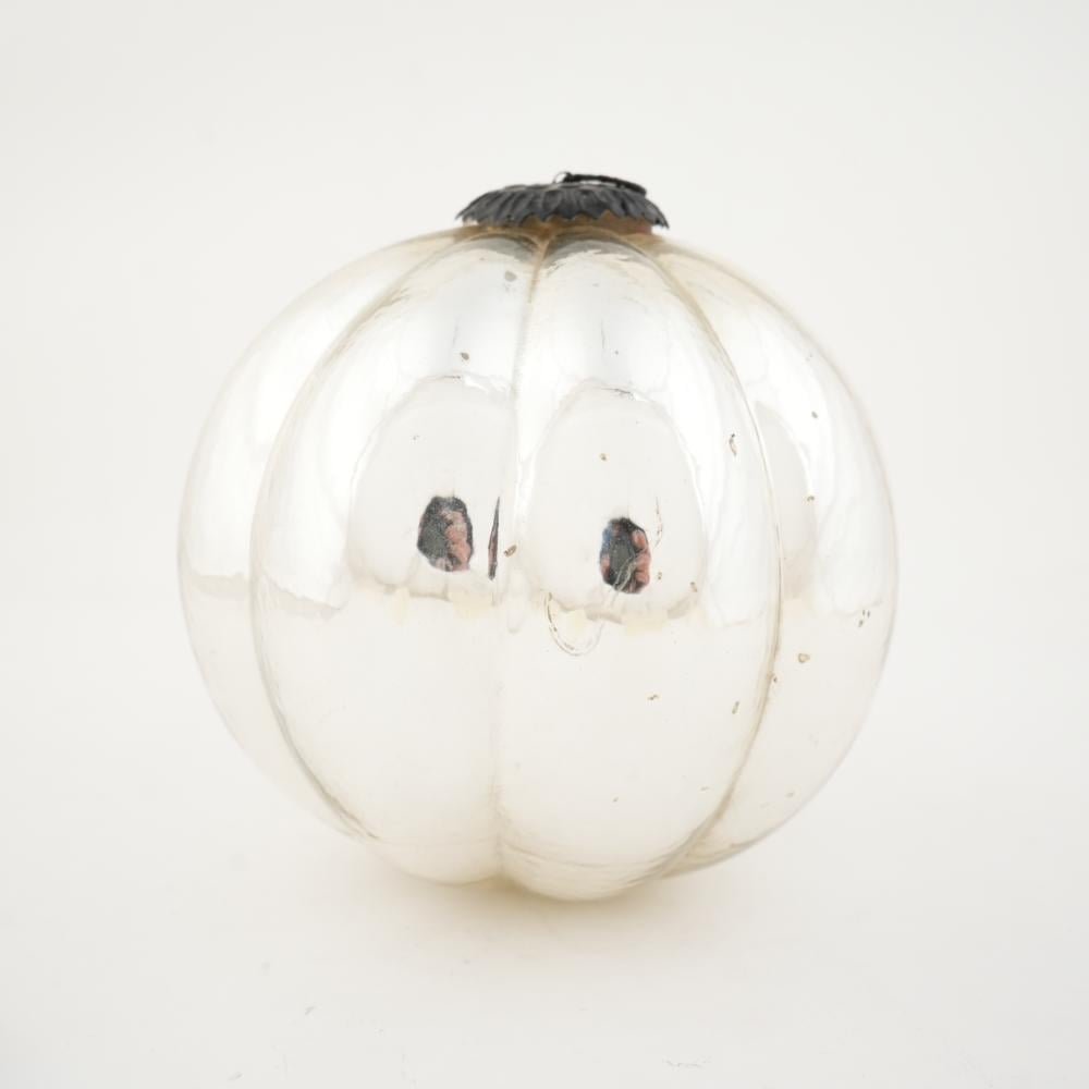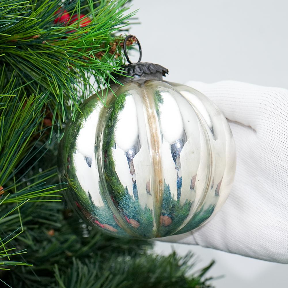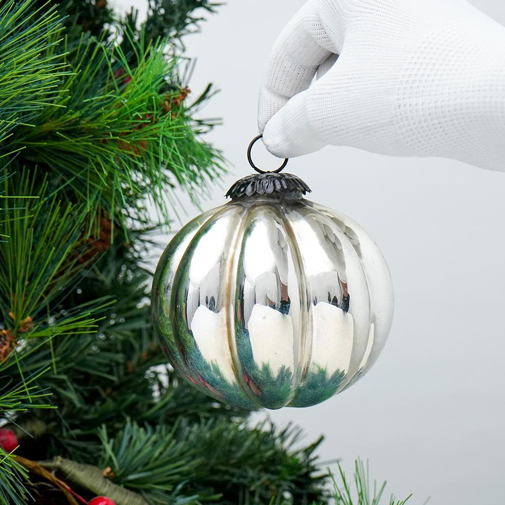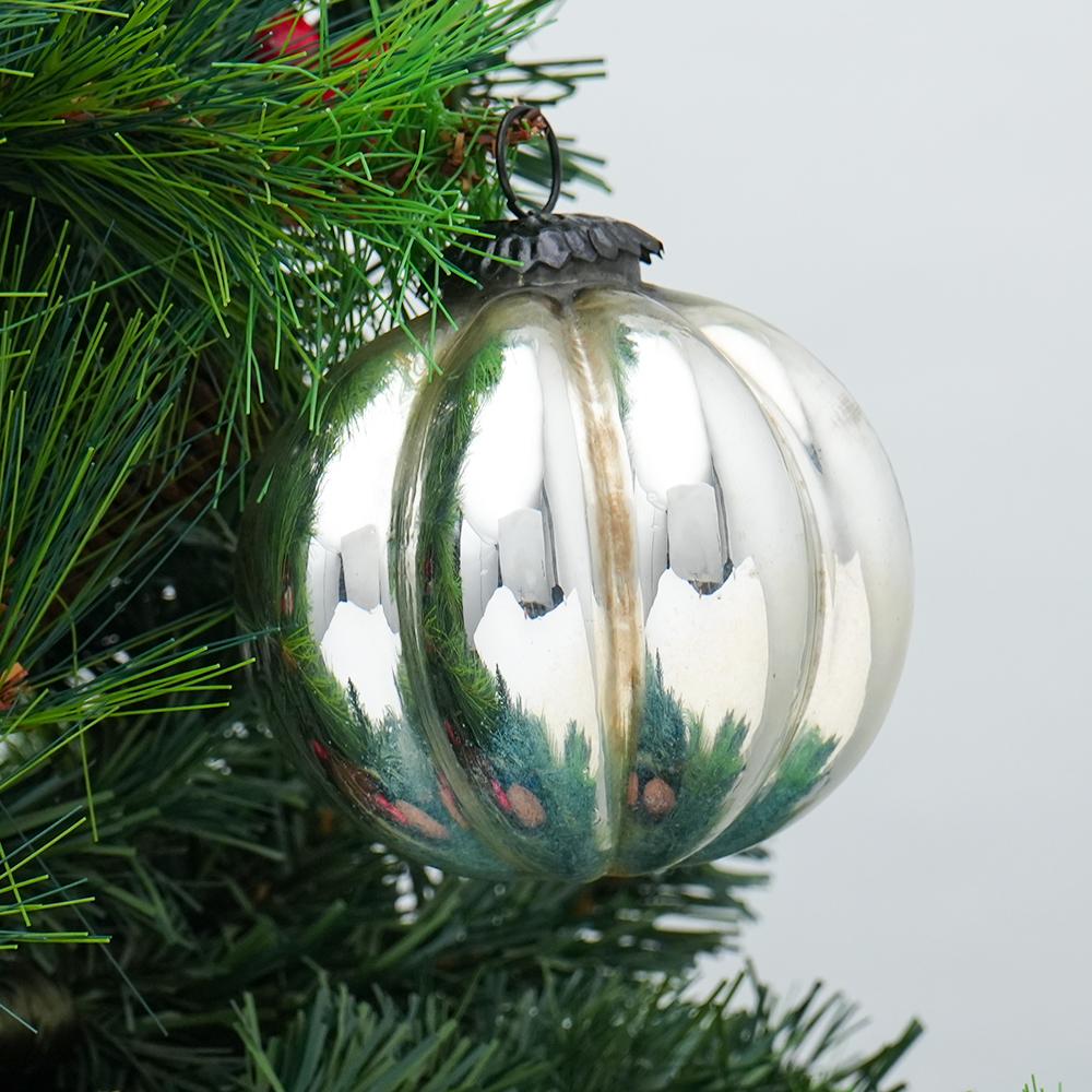 Silver Decorative Melon Shaped Christmas Ornament . Crafted from high-quality glass with a smooth glossy finish, this decorative bauble adds a classic and festive touch to Christmas trees, wreaths, and holiday displays.