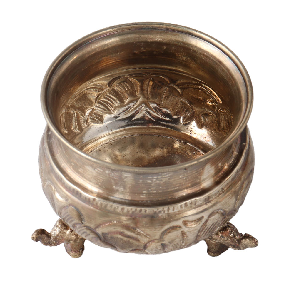 Indian master craftsmen use age-old techniques to create old floral design embossed Urli or bowl eighth Elephant legs. This bowl, also known as a urli, is unusual, antique, and artistically finished with ethnic and antique silver. Use it as a fruit bowl, centerpiece, to exhibit live plants and flowers, as a gift for loved ones for Diwali, Christmas, and the New Year, or as a housewarming present. This exceptional artistic silver-plated bowl or urli is a wonderful display piece, useful accessory, or thoughtful gift idea.