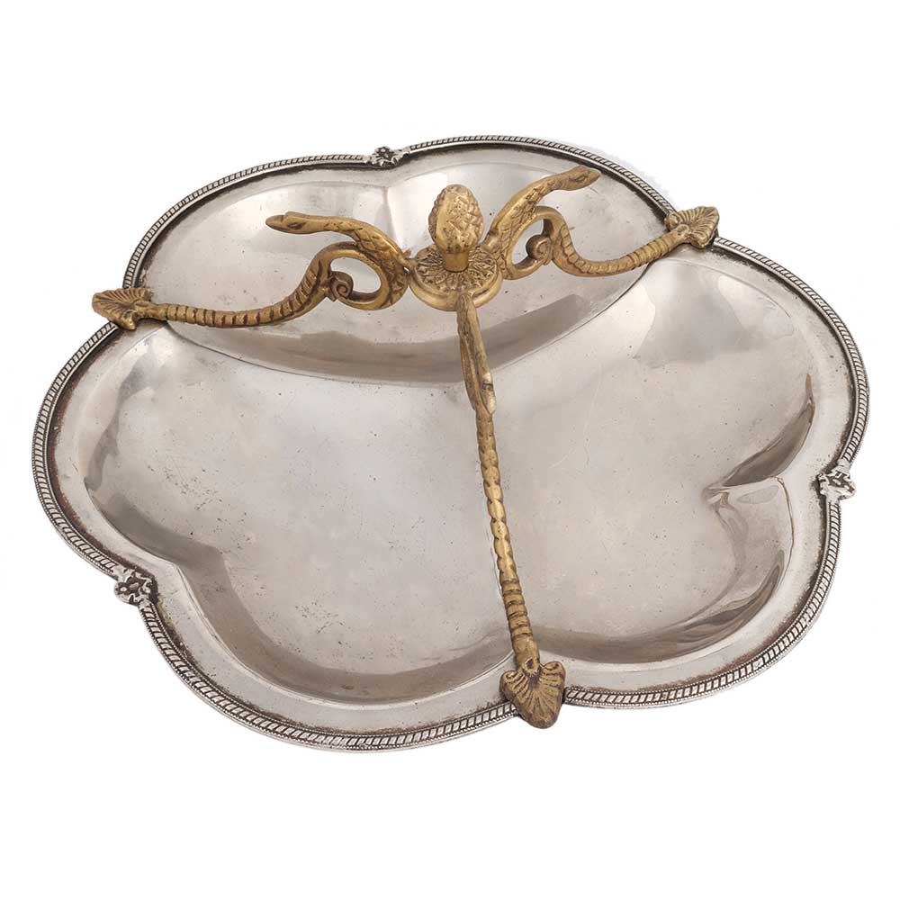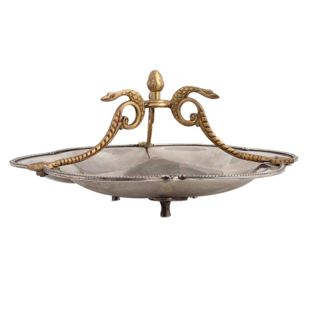 Artistic Silver metal Serving dish with golden snake handles to old the dish from one place to another. It has scalloped edges with lovely beaded border . Wedding decoration, Diwali decoration, Hotel Decoration, Diwali gift, New year gift for friends and family.