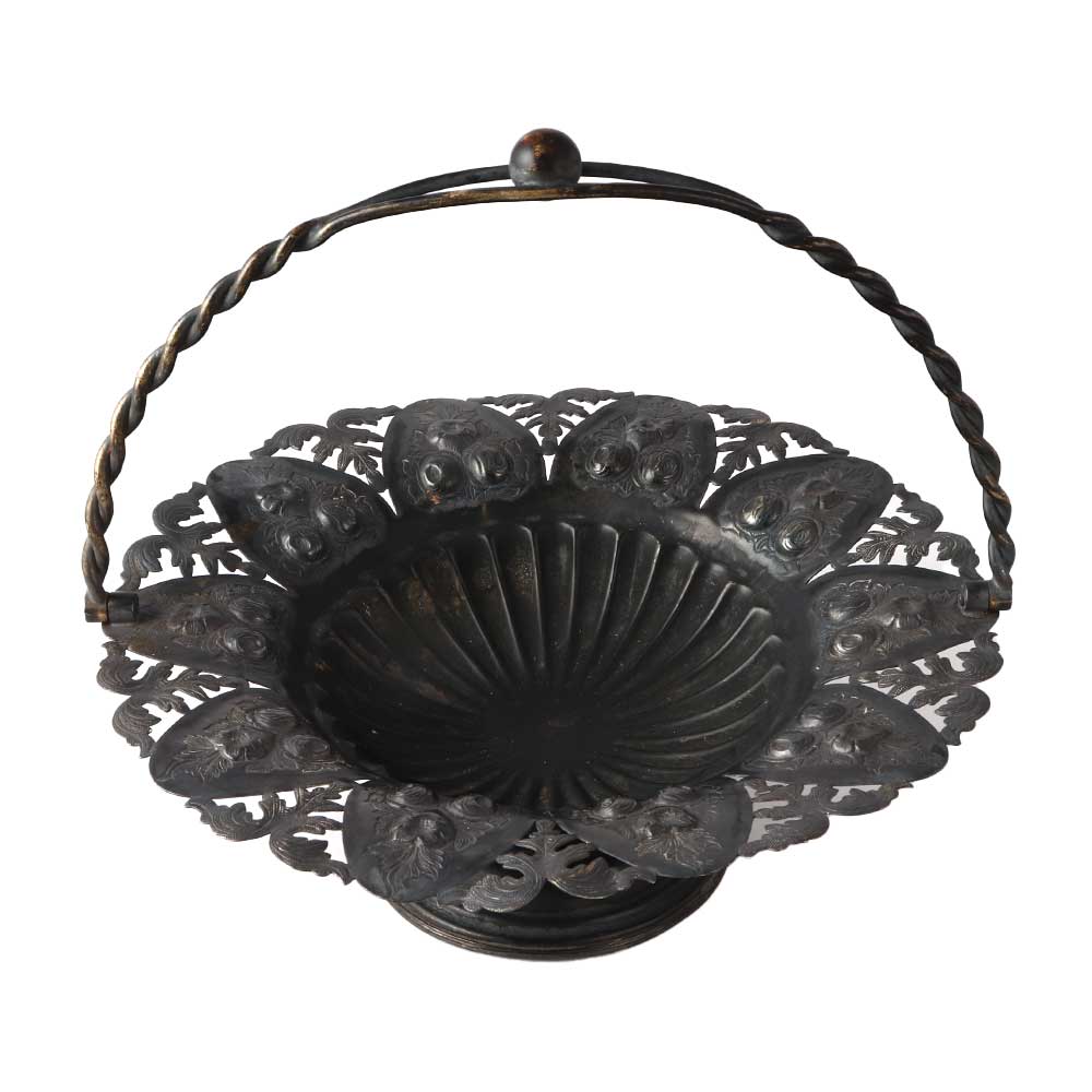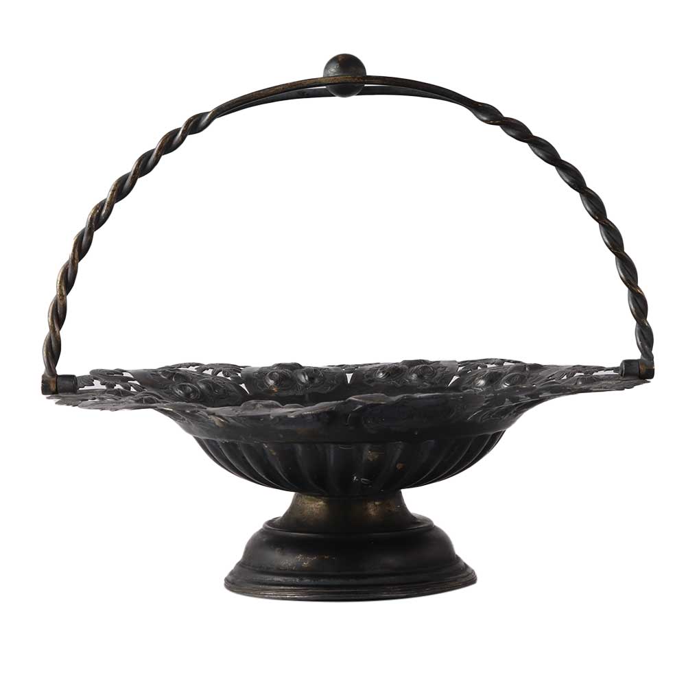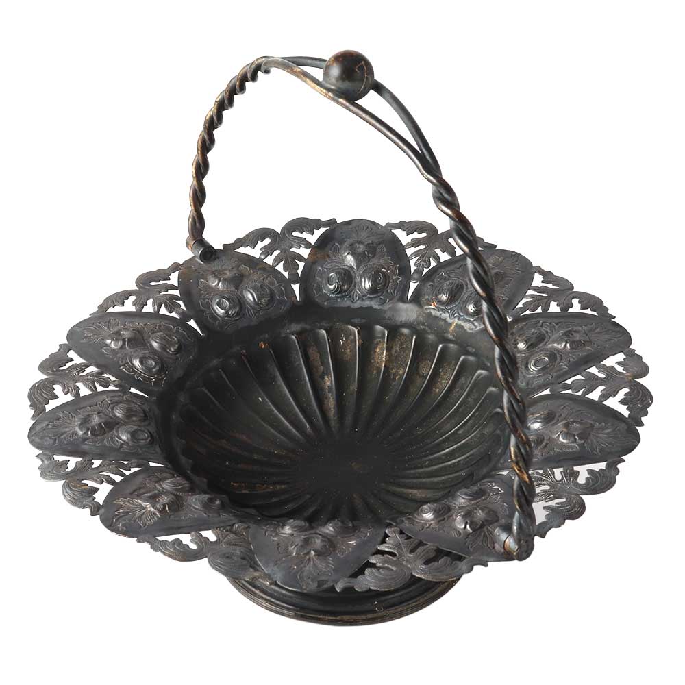 An elegantly pierced Victorian fruit or bridal basket made of English silver metal with an elaborate handle that has an attractive border with elevated scrolls, foliage, and flowers design  The handle is simply detachable from the sides and may be moved backwards and forwards. Use it as a candy dish, for flower presentation or as a fruit basket.Â