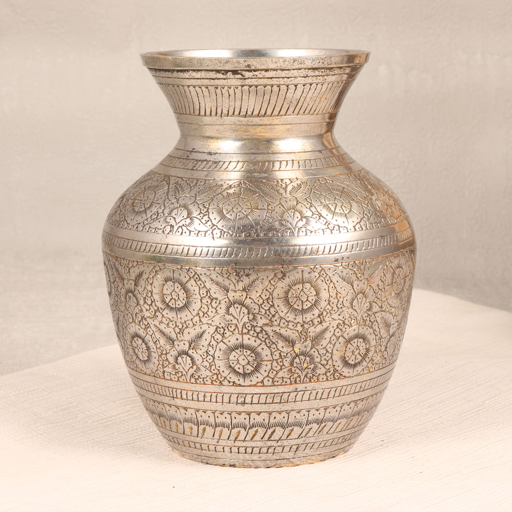 Buy a Brass Flower Pot online and get a hassle free delivery right at your doorstep. Handmade by professional Indian artisans, this timeless piece is crafted from high-quality brass, ensuring durability and a radiant aesthetic. The pot is nickel-plated, accentuating its lustrous surface, while intricate engravings add a touch of sophistication. Boasting an antique silver finish, this flower pot effortlessly blends vintage charm with contemporary allure. Its versatile design makes it a perfect addition to any space, be it at home, in the office, a restaurant, hotel, or cafe. As an indoor flower pot, it brings nature indoors with style and grace. Elevate your decor by showcasing it as a standalone piece or add it to your vintage collection for a touch of nostalgia. This brass flower pot isn't just a decorative item, it's a thoughtful gift for your family, friends or relatives on special, festive, or auspicious occasions.