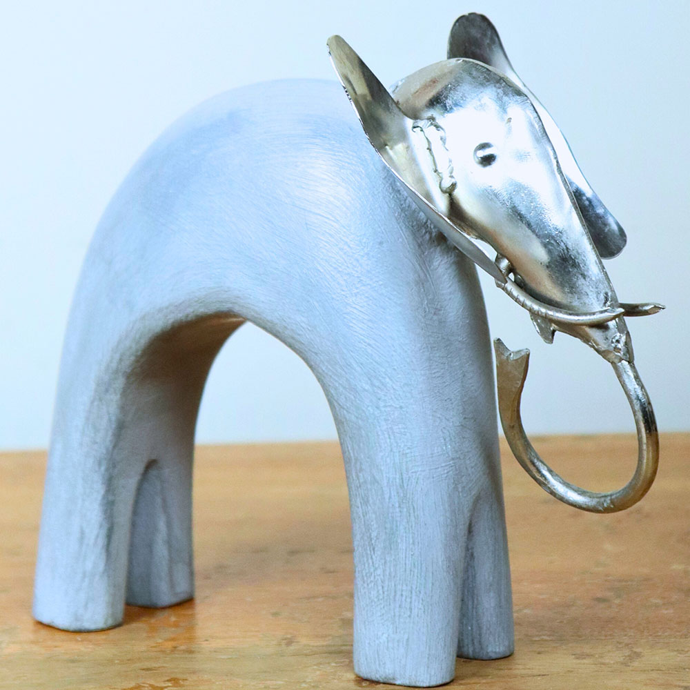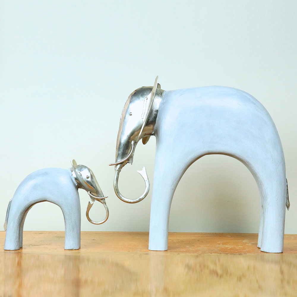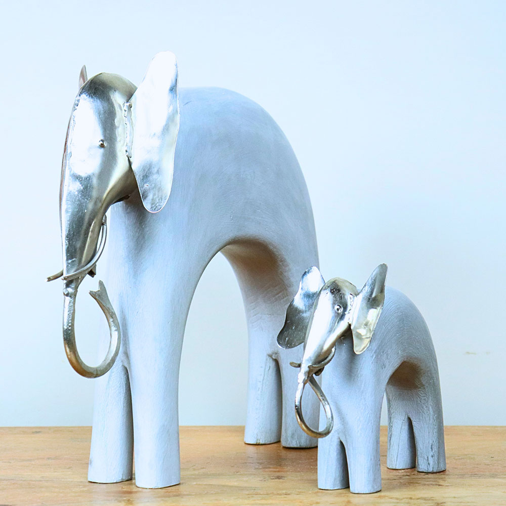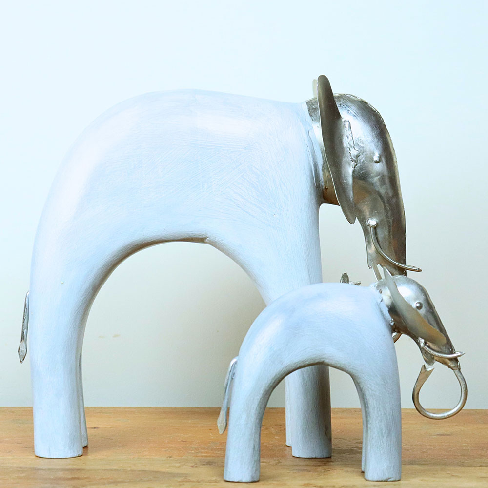 This elephant pair marries smooth matte white wood with polished metal trunks and ears, forming a refined, modern aesthetic. Their contrasting sizes play with balance and proportion, lending elegance to shelves and tables while evoking feelings of harmony and simplicity.