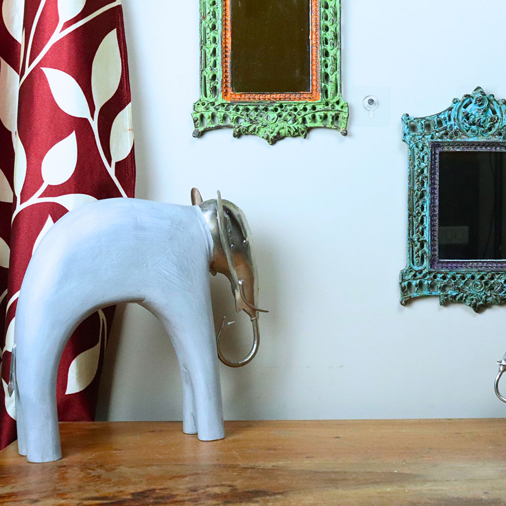 These hand-carved wooden elephant sculptures blend sustainably sourced wood with polished metal ears and trunks, finished in a smooth matte white for modern elegance. Sold as a large and small pair, they offer a versatile, minimalist accent for collectors, gifters, and interior stylists wanting understated charm and artisanal authenticity. Packed & quality-checked by Indianshelf.