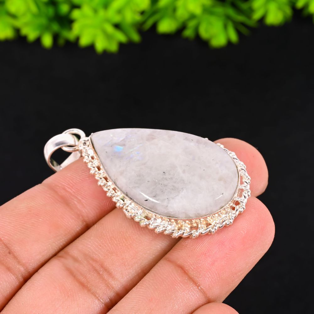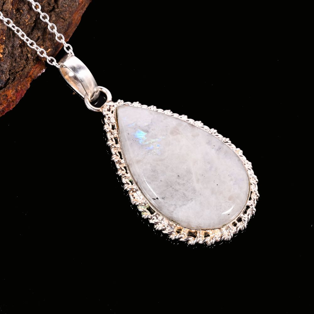 Infused with the radiance of rainbow hues, this necklace unites brass strength with silver-plated elegance. The centerpiece is a Rainbow Moonstone, prized for its play of light and multicolor sheen, which makes every angle shimmer with mystery and grace. Measuring 18 inches, the pendant rests naturally at the neckline, exuding charm whether paired with festive attire or modern wear. This piece is more than jewelry — it’s a wearable expression of beauty, symbolism, and artisan tradition.