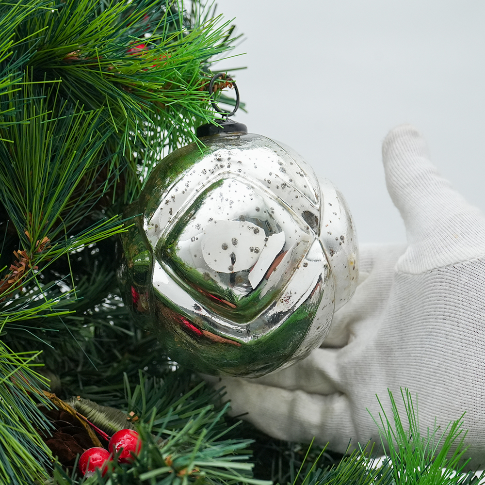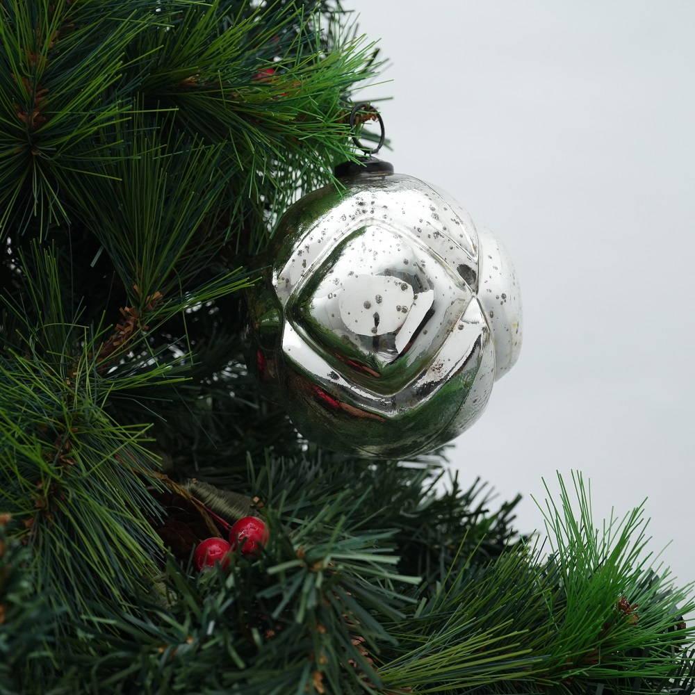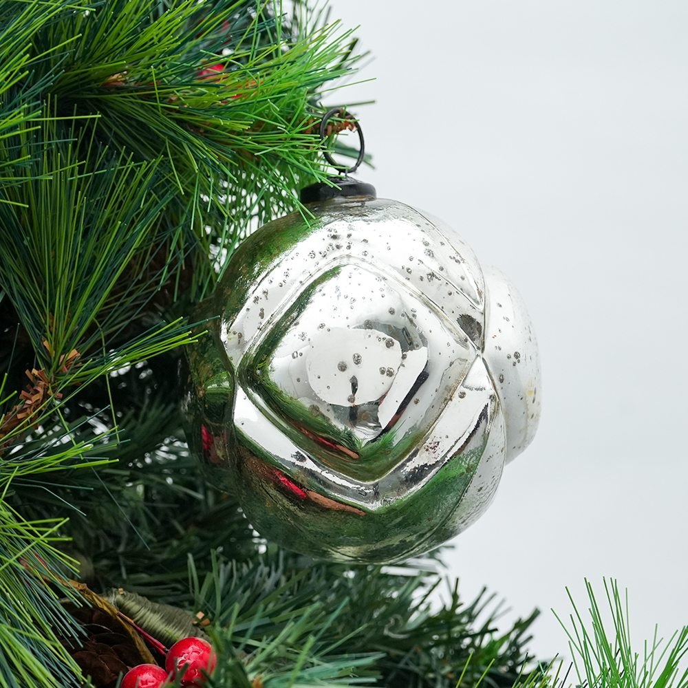 Silver Round Decorative Mercury Glass Hanging Ornament. Crafted from high-quality glass with a smooth glossy finish, this decorative bauble adds a classic and festive touch to Christmas trees, wreaths, and holiday displays.