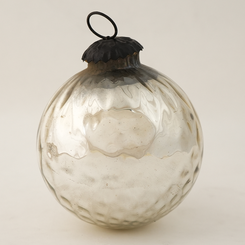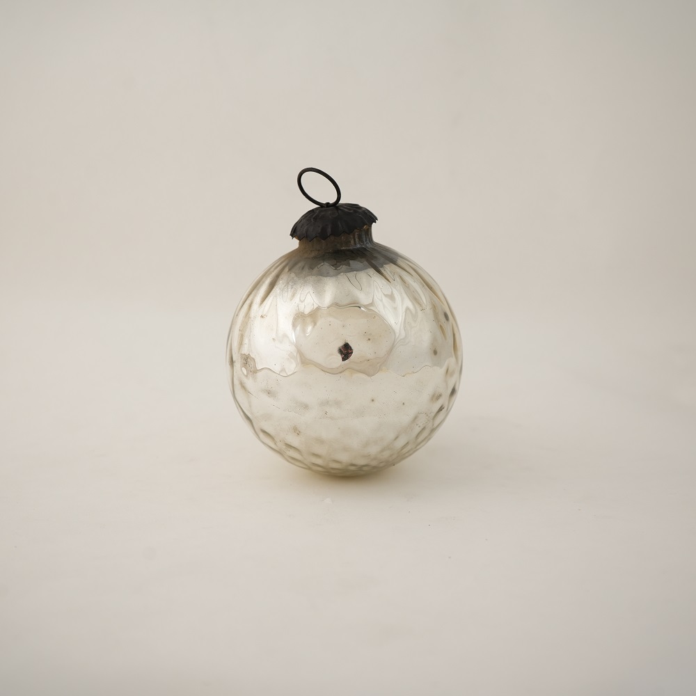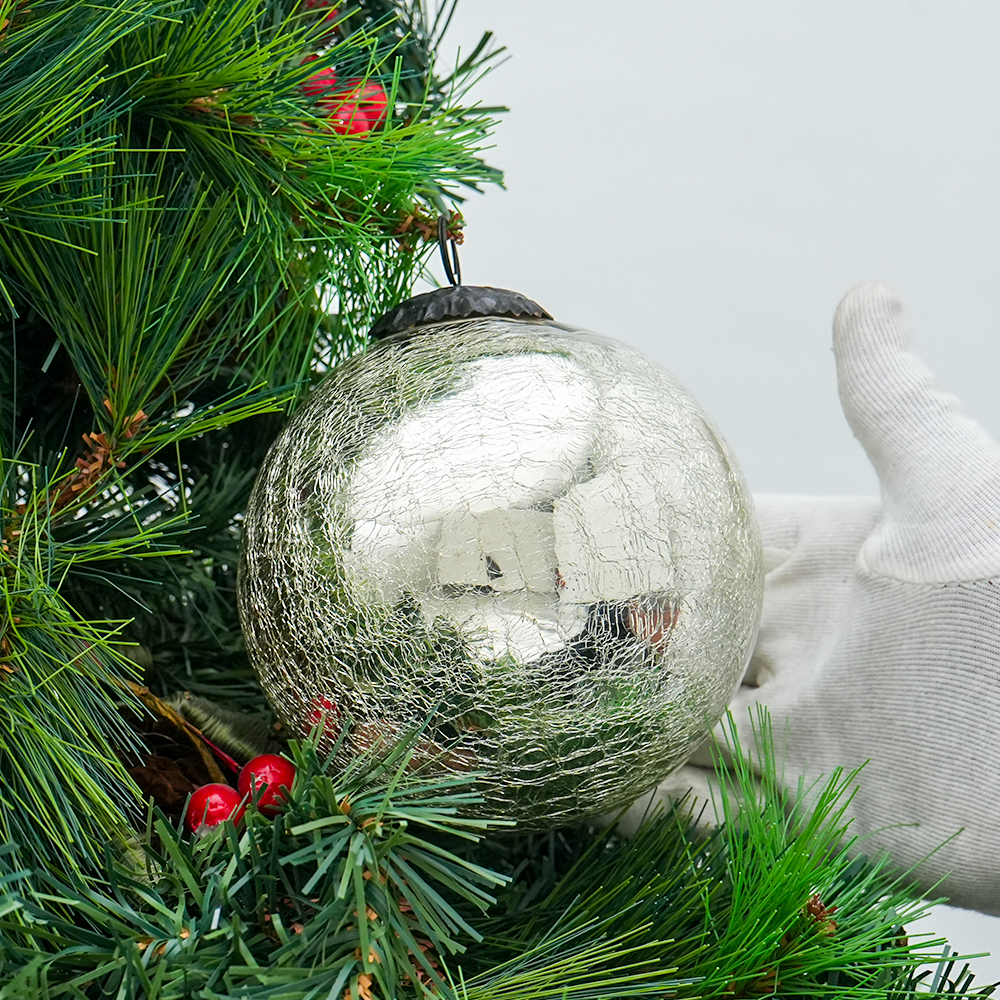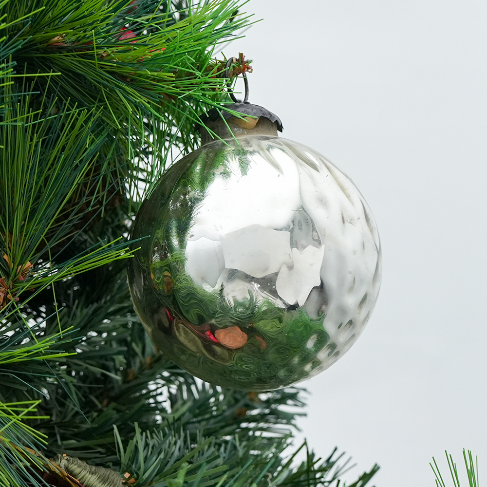Silver Round Glass Hanging Ornament For Christmas Tree. Crafted from high-quality glass with a smooth glossy finish, this decorative bauble adds a classic and festive touch to Christmas trees, wreaths, and holiday displays.
