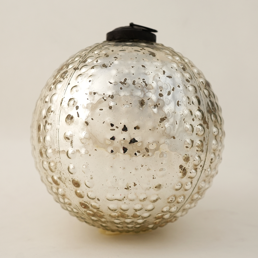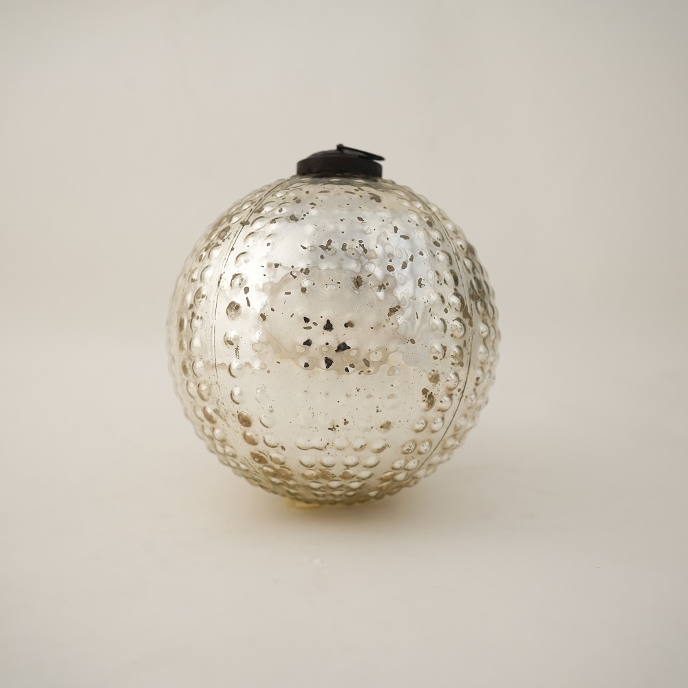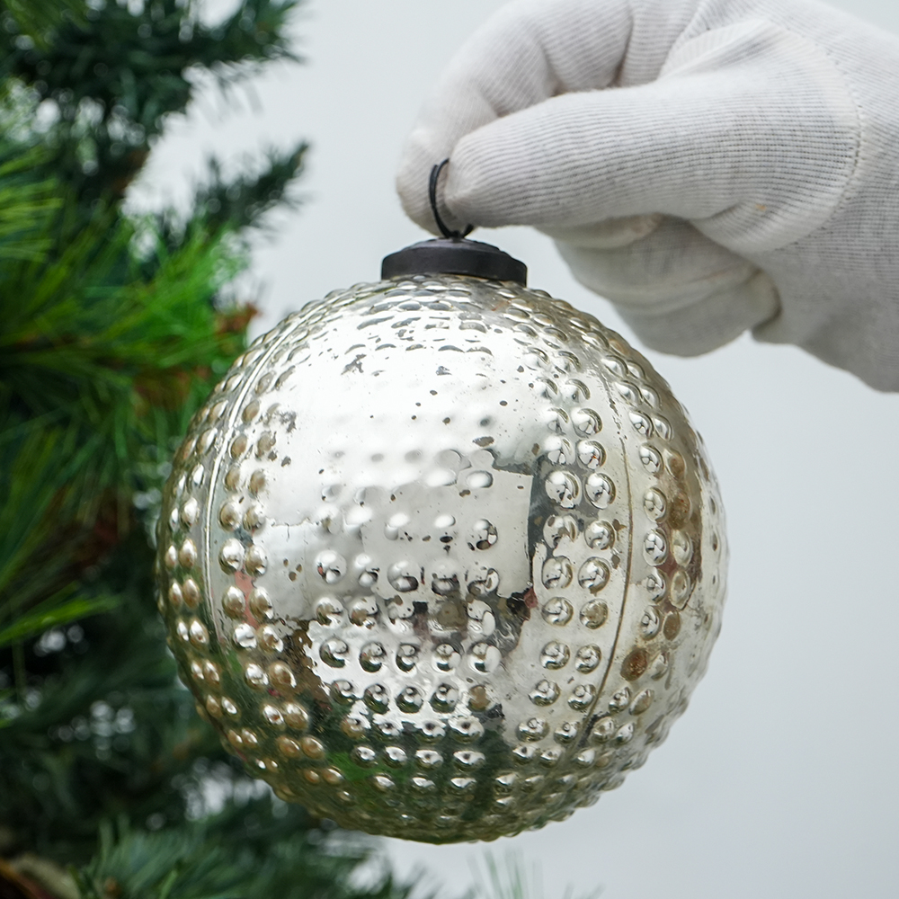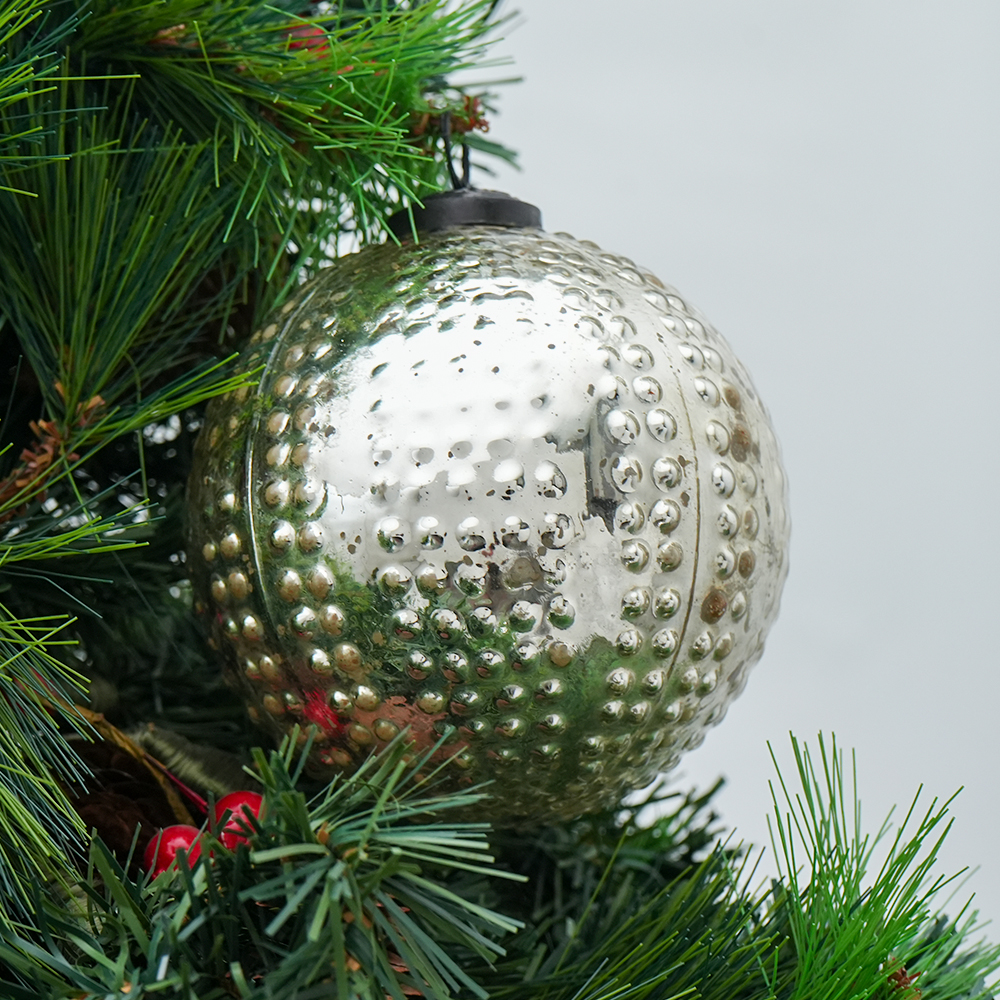 Silver Round Mercury Glass Hanging Ornament For Christmas Tree. Crafted from high-quality glass with a smooth glossy finish, this decorative bauble adds a classic and festive touch to Christmas trees, wreaths, and holiday displays.