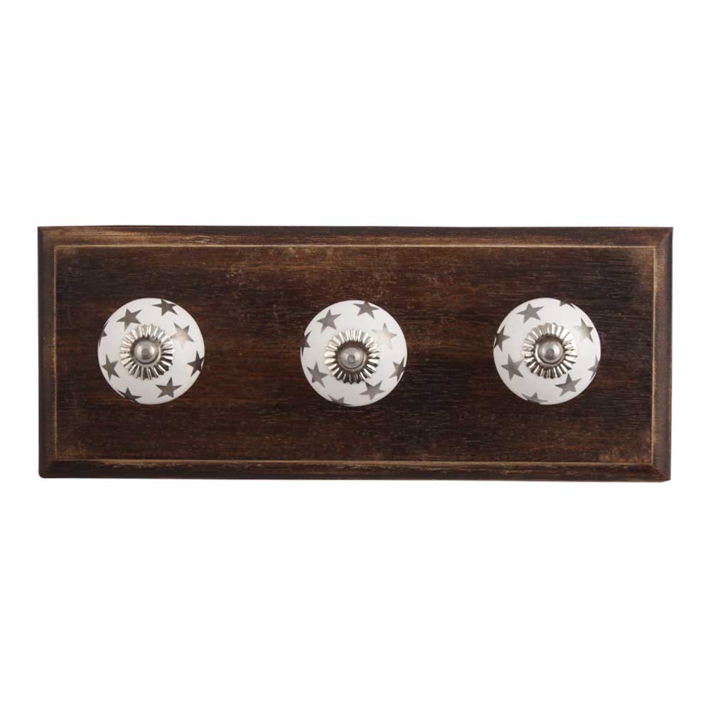 Silver Star Ceramic Wooden Hook. A Perfect Complement to the Soft Tone of the Wood are these White Traditional Hat & Coat Hook Made of Genuine Porcelain and Brass. It can be use to Hang Jewellery, Leashes, Towels, Scarves, Light Weight Sweaters, Caps Etc.