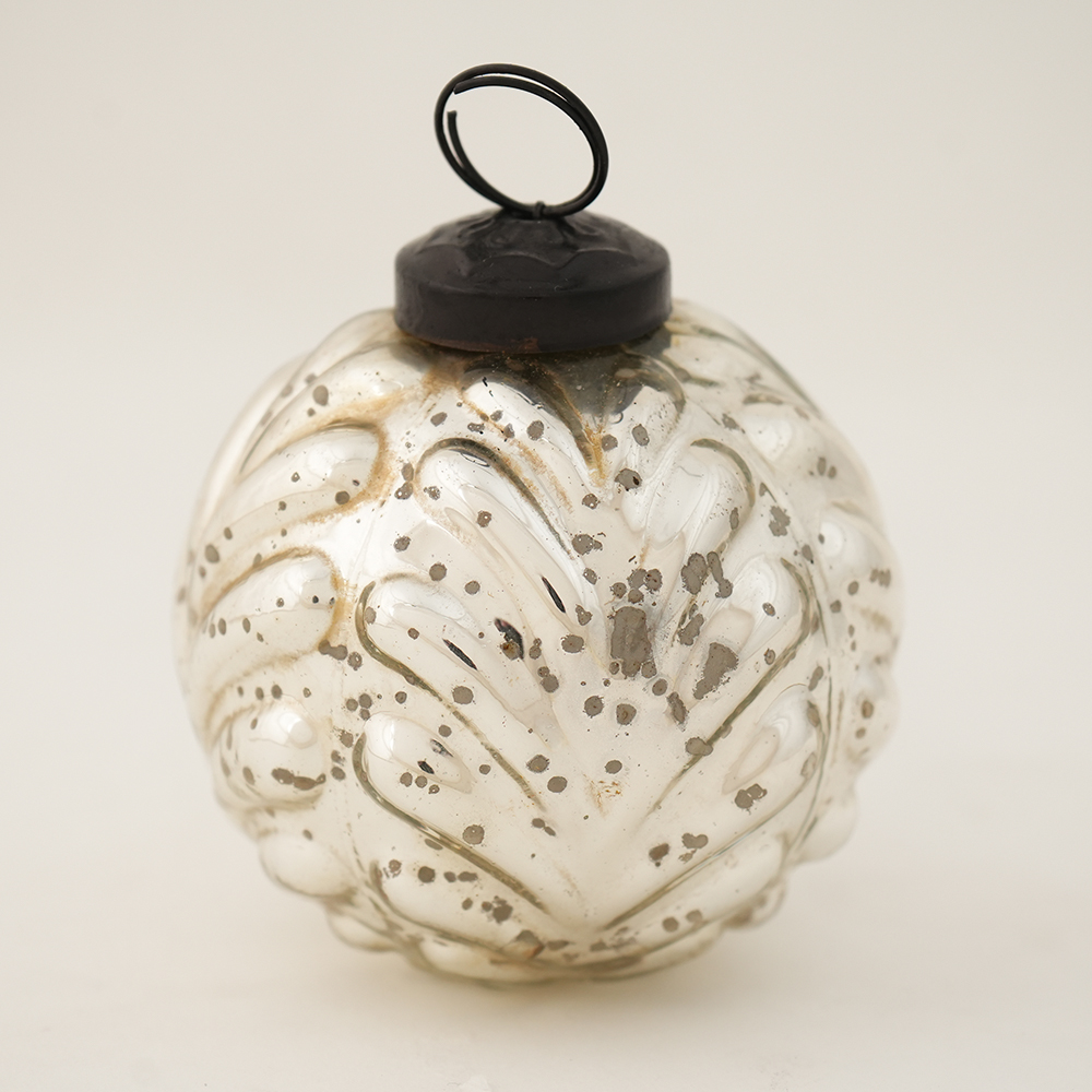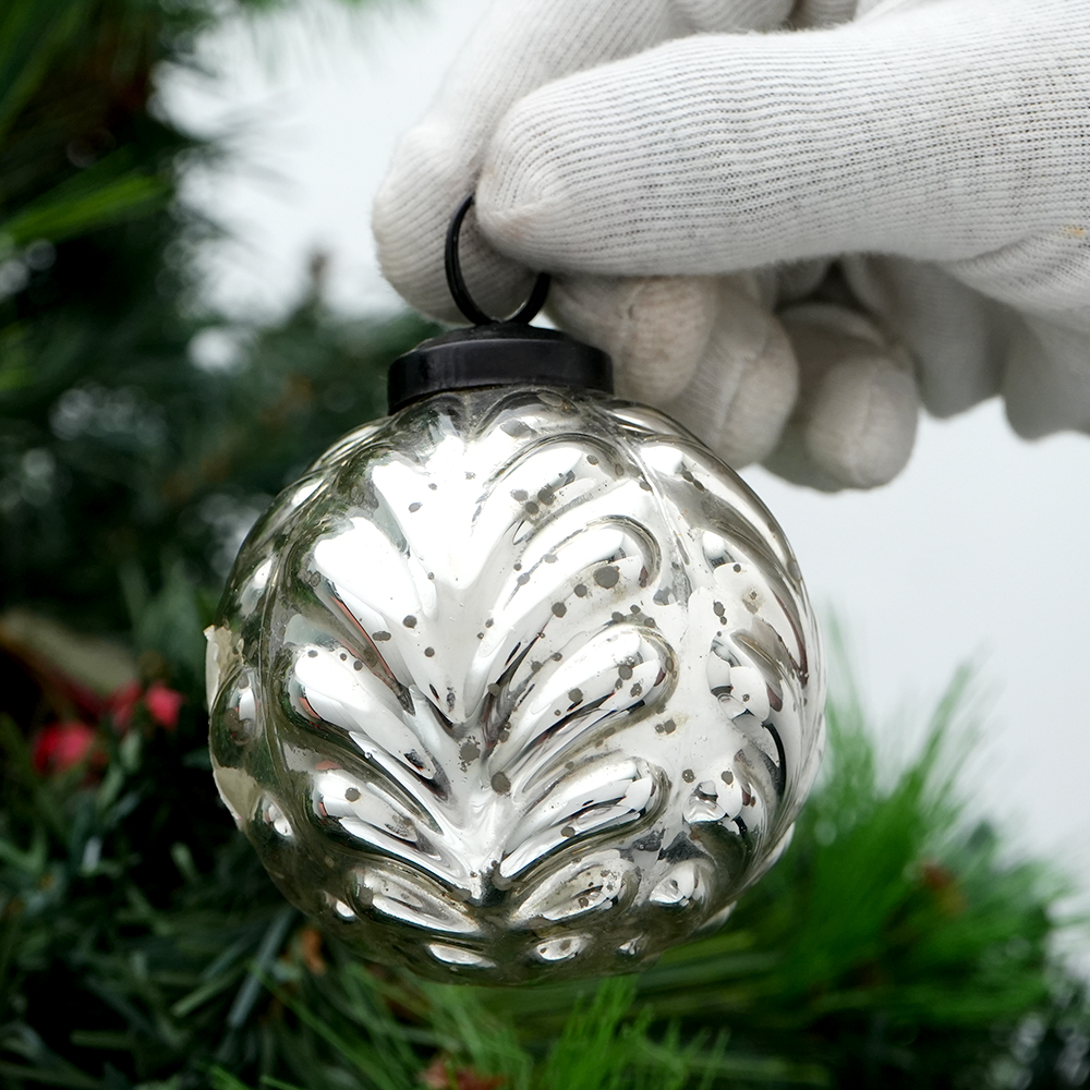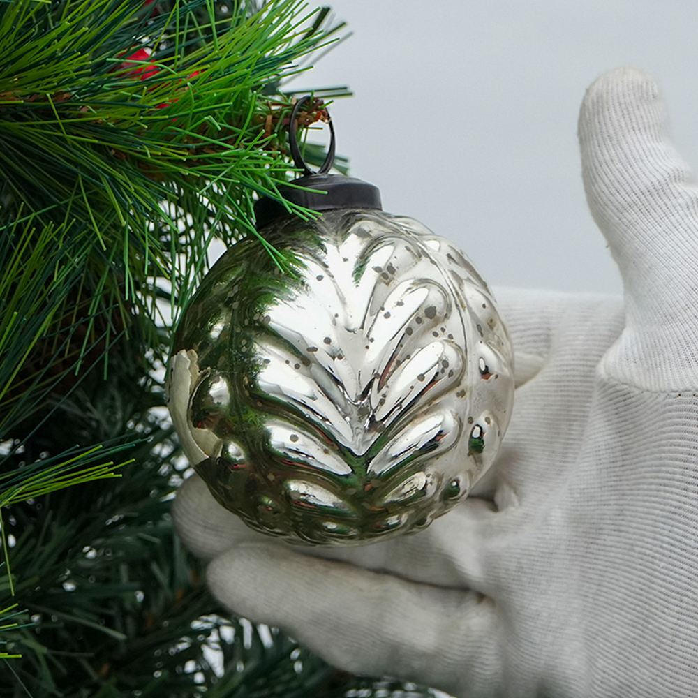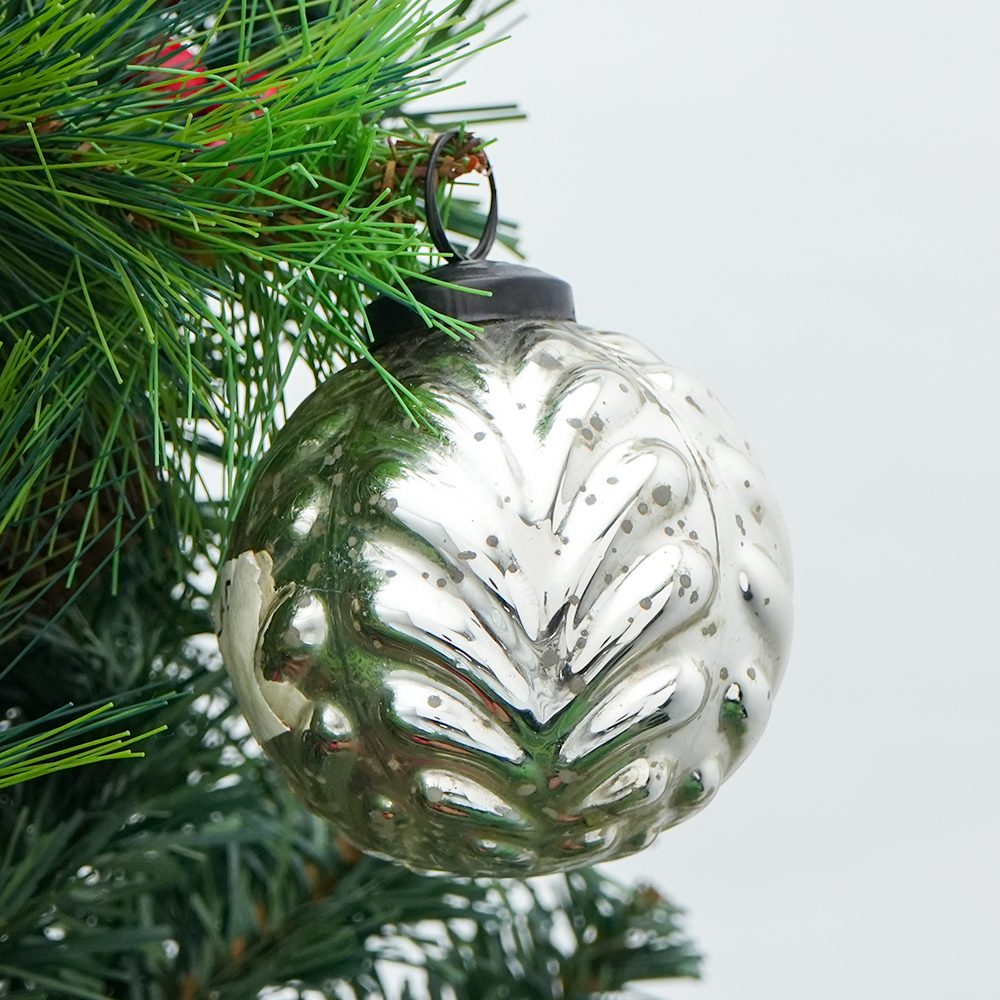 Silver Vintage Round Mercury Glass Christmas Ornament. Crafted from high-quality glass with a smooth glossy finish, this decorative bauble adds a classic and festive touch to Christmas trees, wreaths, and holiday displays.