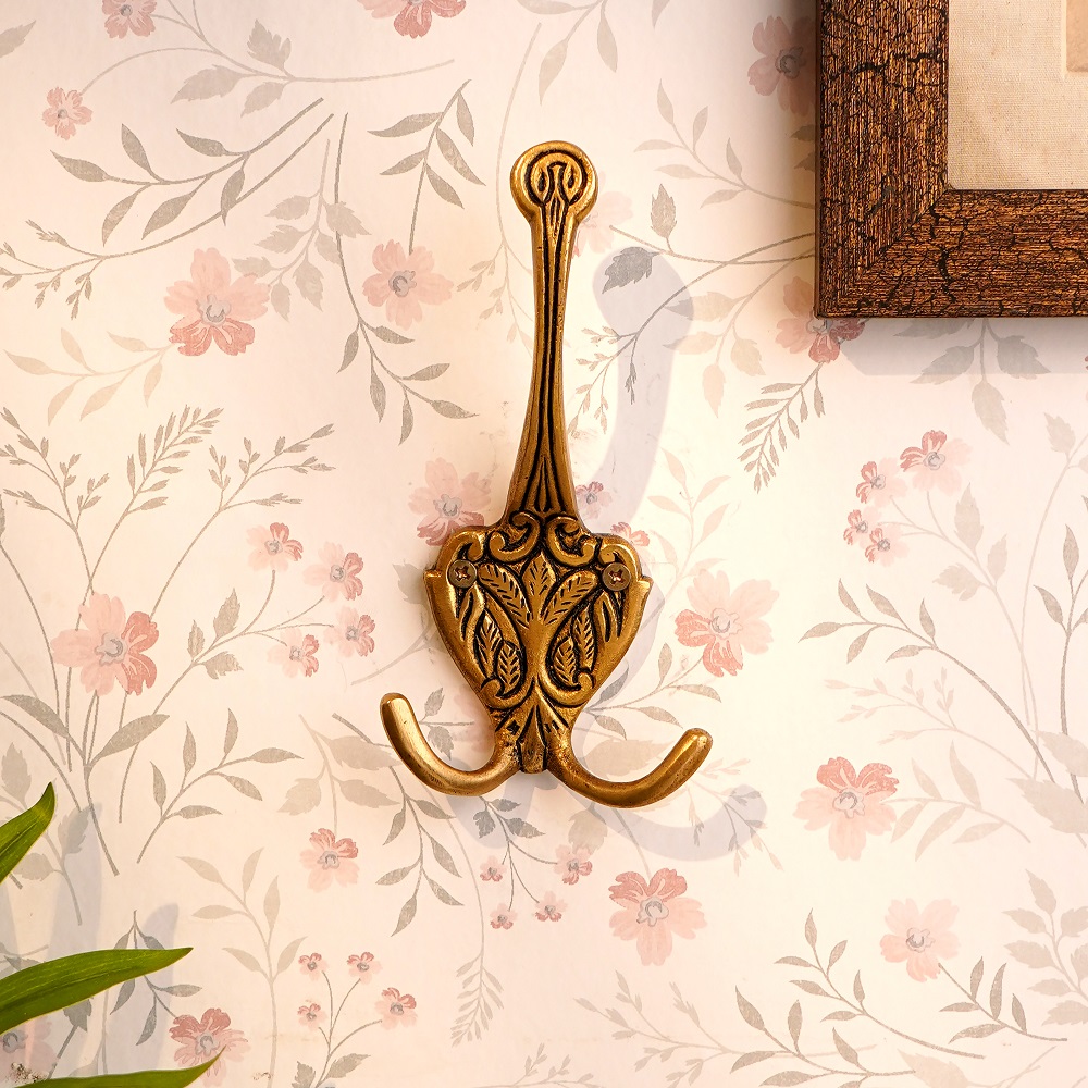 The elegant floral engraving on the brass surface adds a touch of sophistication to the simple yet functional design. This tri-hook not only provides ample space for hanging coats, bags, scarves, or accessories, but it also enhances your décor with its intricate craftsmanship. The warm brass finish gives it a luxurious feel, making it a standout feature in any room.