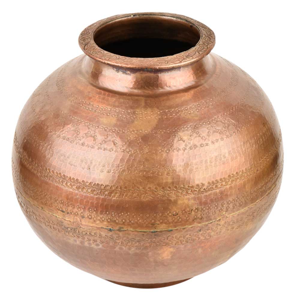 This hand crafted brass water pot is made by expert artisans of India . This brass pot has a bulbous body was filled with holy water as a nice patina was used in temples and other religious places . It has a bottom rim for support an has a large belly to store water and small mouth .It comes with a nice copper finish.