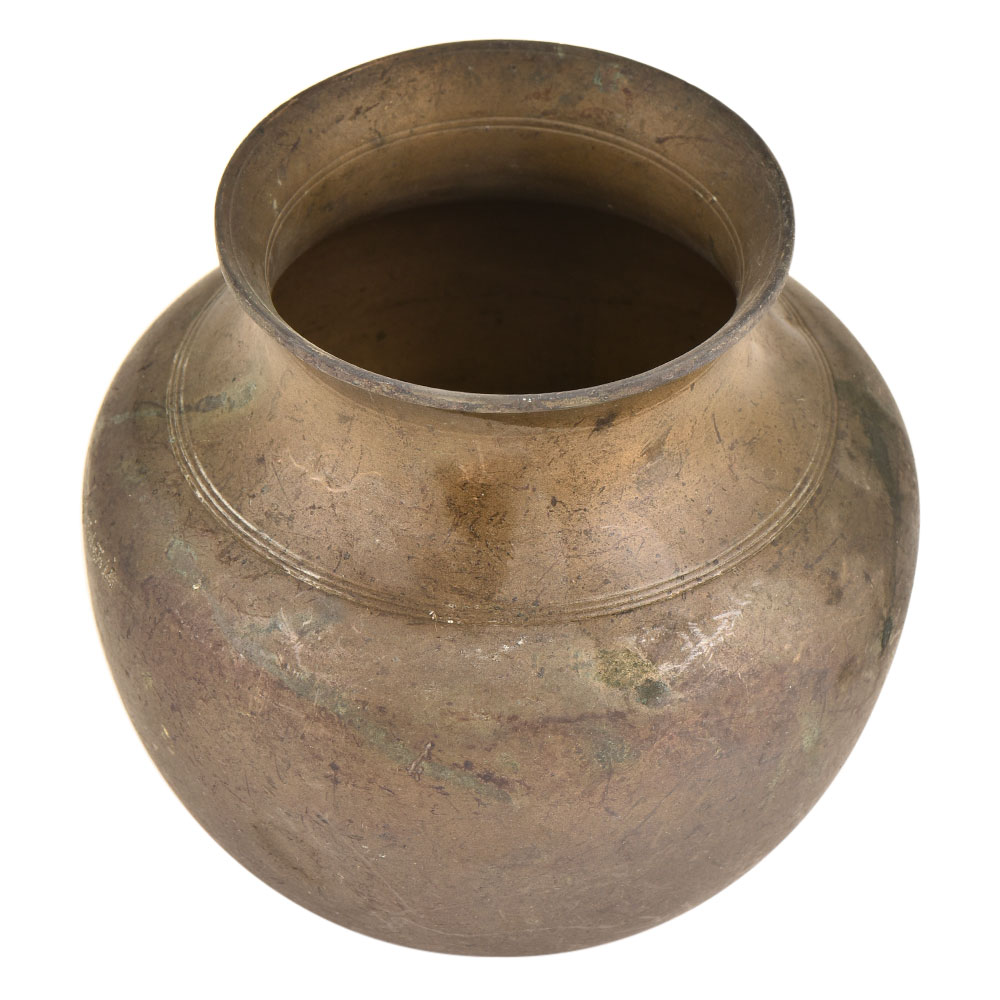 This is a rather unique shaped lota or pot with rough and uneven tribal carvings on the surface a protuding rim or neck with a small mouth . The pot would make a lovely shelf ornament flower pot or table display.