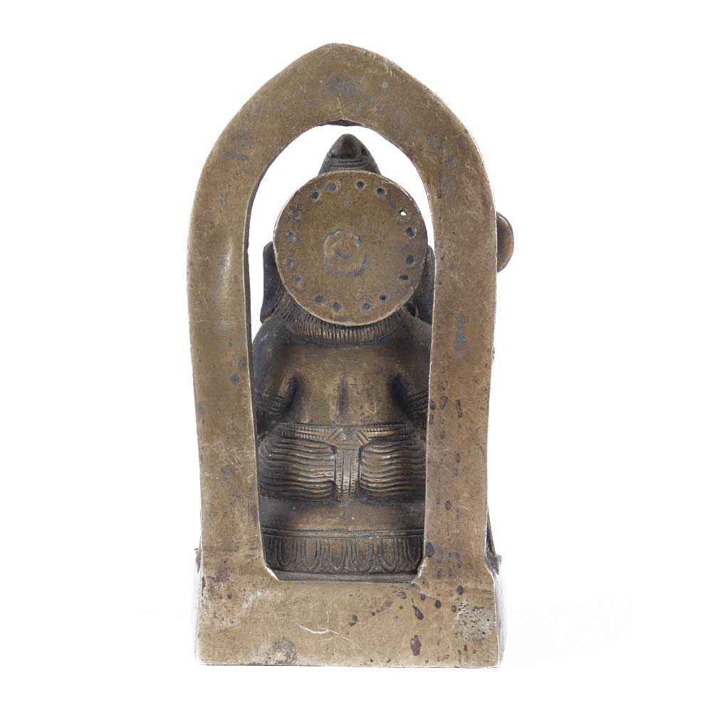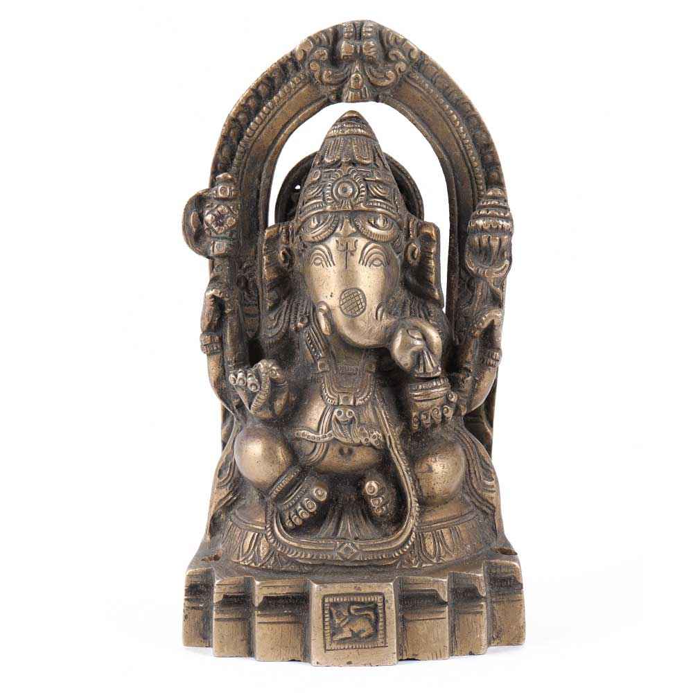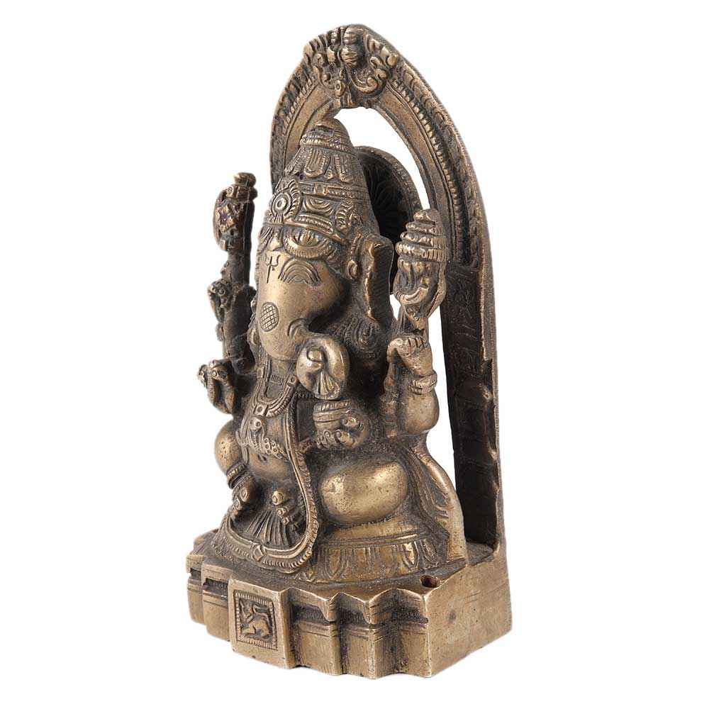 Lord Ganesha's idol is crafted from brass and has a brown aged finish. Lord Ganesha and his vahana, the Indian bandicoot rat, are depicted with stunning carvings and a gorgeous arch behind them. This idol can be used in pooja rooms, exhibits, showrooms, and offices at home. Perfect gift for weddings, formal occasion, Navarathri, Deepawali, and other special occasions.