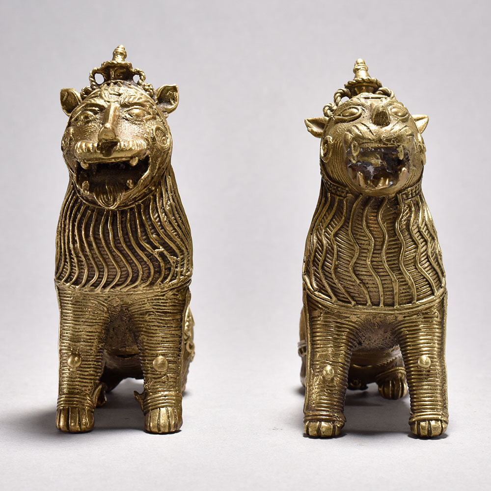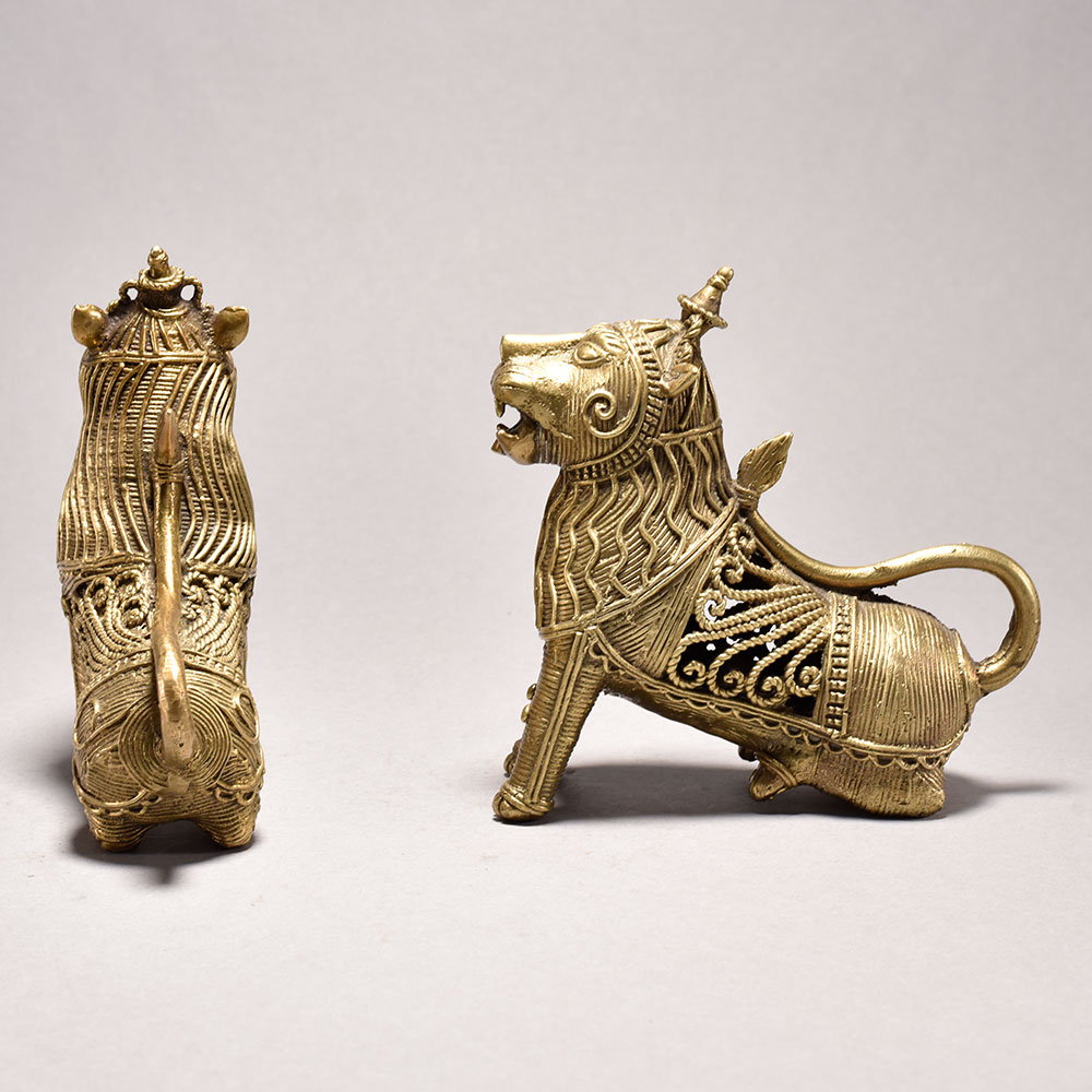 Unleash the majestic power of the wild with this stunning tribal art lion pair.These captivating lion sculptures are a testament to the rich cultural heritage of India. Meticulously crafted using time-honored techniques, each detail has been lovingly rendered to perfection. Display this pair and let their commanding presence transport you to the heart of the untamed wilderness. A breathtaking addition to any space, these lions will elevate your decor while sparking wonder and admiration in all who behold them. Handcrafted from metal using the traditional lost wax casting process This timeless piece is handcrafted by skilled artisans using time-honored techniques, ensuring each creation is truly one of a kind. Its versatile design makes it suitable for living rooms, bedrooms, offices, or meditation spaces, bringing a sense of heritage and style wherever it is displayed. This timeless piece is handcrafted by skilled artisans using time-honored techniques, ensuring each creation is truly one of a kind. Its versatile design makes it suitable for living rooms, bedrooms, offices, or meditation spaces, bringing a sense of heritage and style wherever it is displayed.