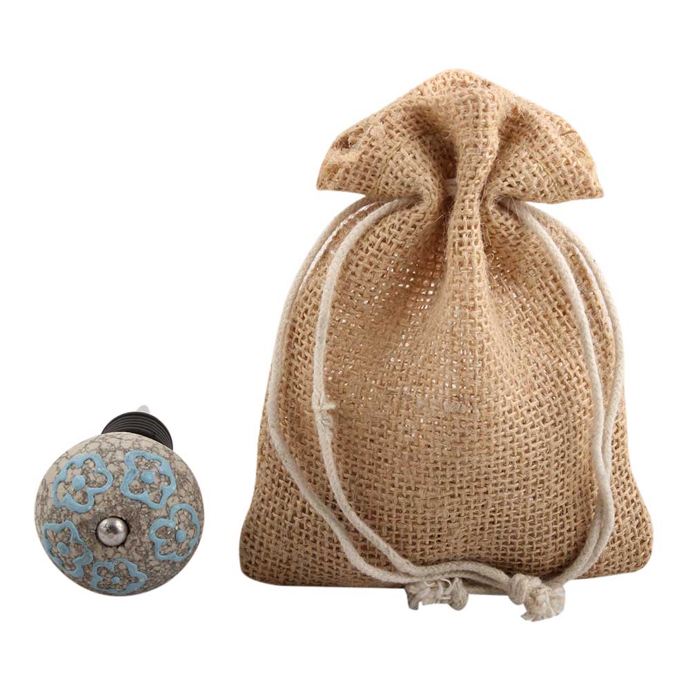 Sky Blue Floral Crackle Ceramic Wine Stoppper. Zinc Alloy Wine Bottle Stopper with Attractive Jute Bag Packaging.