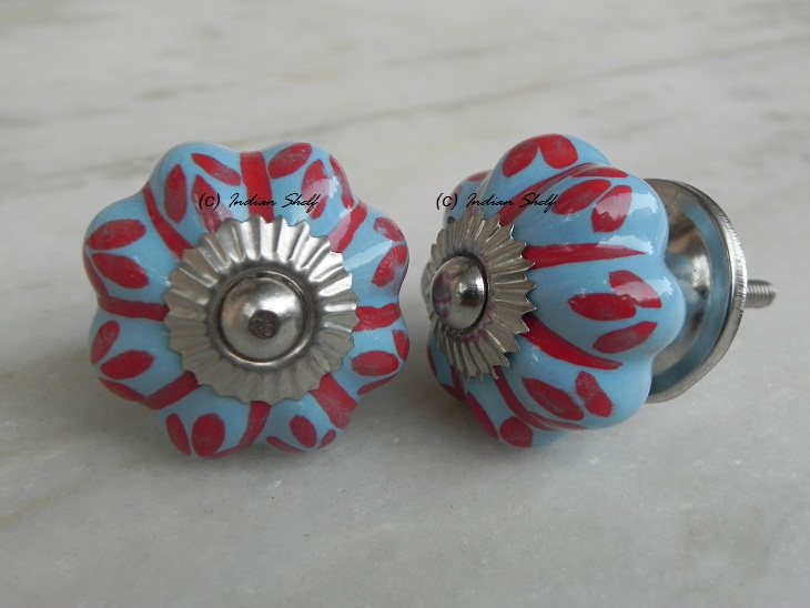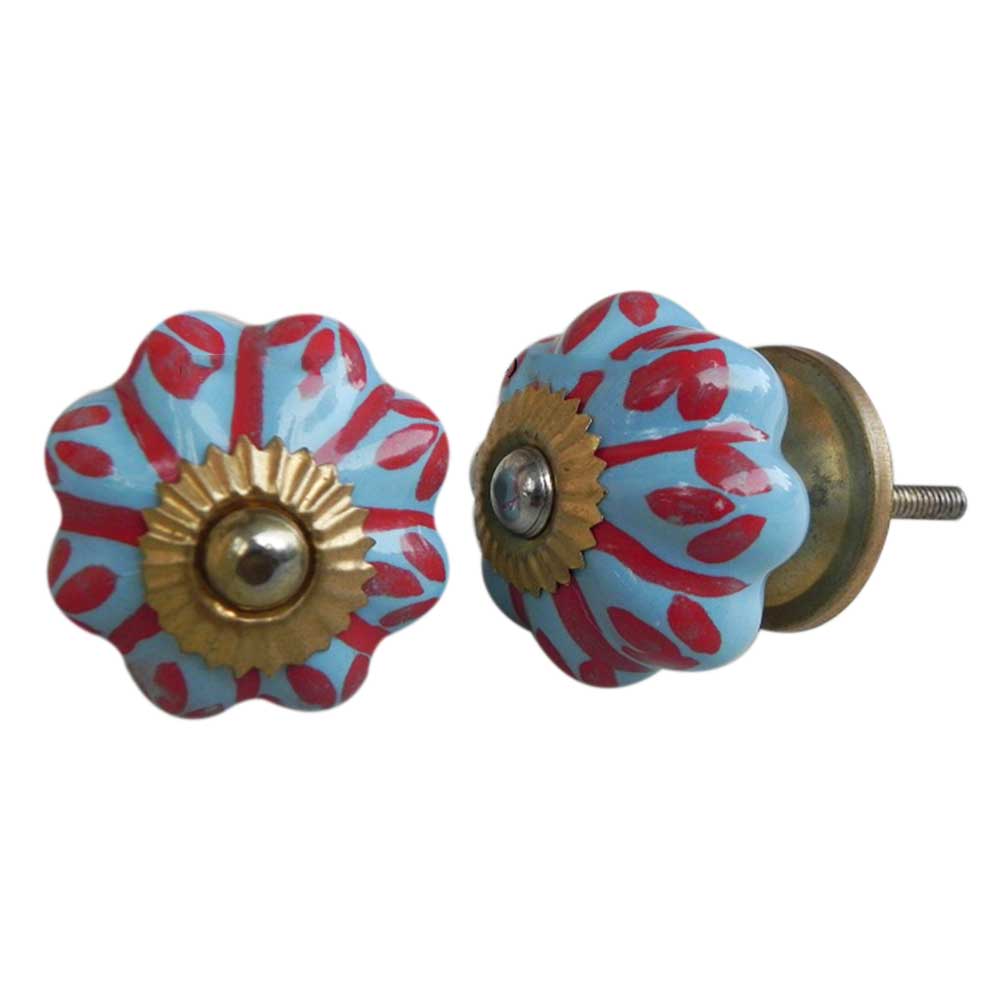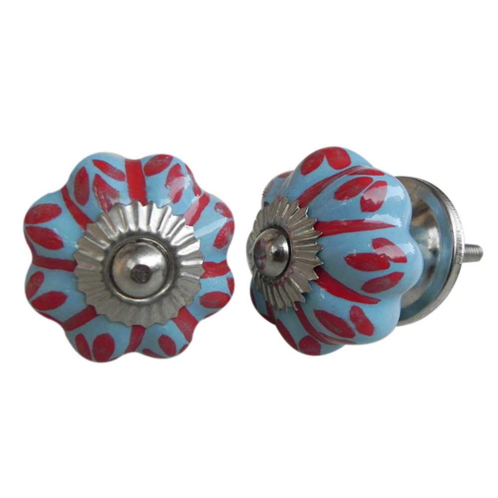 Sky Blue Red Flower Striped melon shape Ceramic knob. Ideal for kitchen cabinets, kitchen drawers, dining room, bed room, chest drawers, dressing tables, almirah