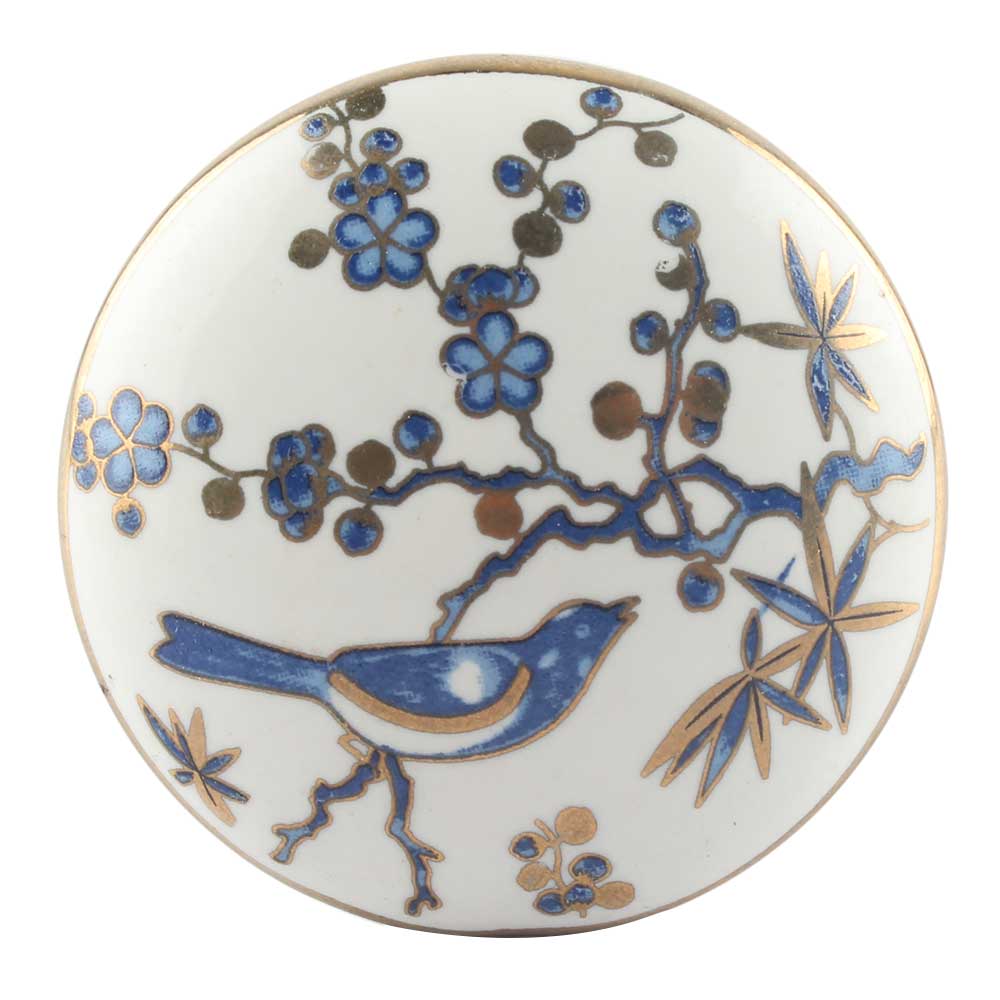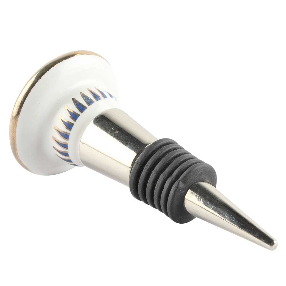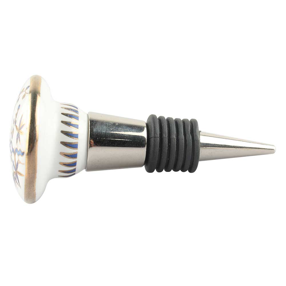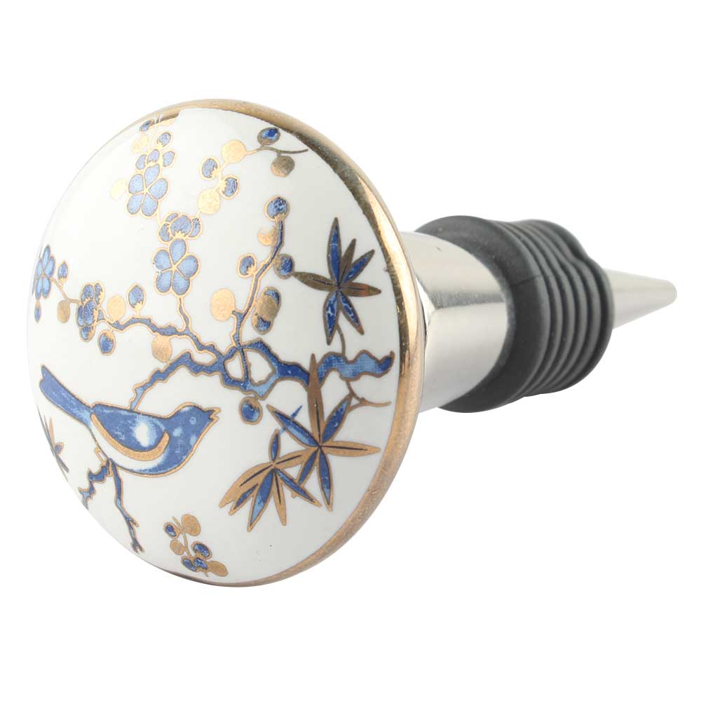 Slate Blue Bird Ceramic Floral Wine Stopper Online. Zinc Alloy Wine Bottle Stopper with Attractive Jute Bag Packaging.