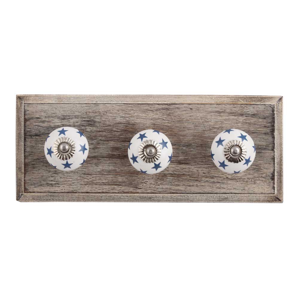 Slate Blue Star Ceramic Wooden Hook. A Perfect Complement to the Soft Tone of the Wood are these White Traditional Hat Coat Hook Made of Genuine Porcelain and Brass. It can be use to Hang Jewellery, Leashes, Towels, Scarves, Light Weight Sweaters, Caps Etc.