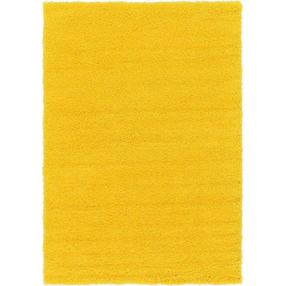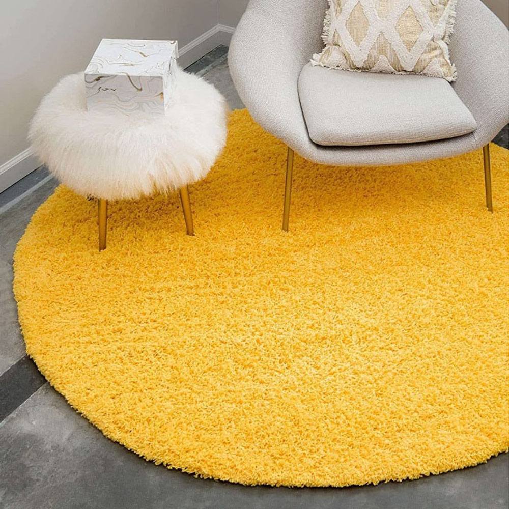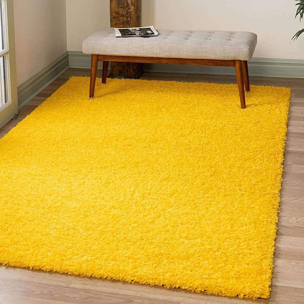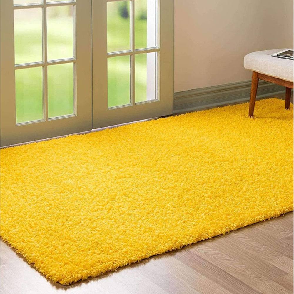 Vacuum regularly with low suction to maintain the fluffy texture. Clean spills promptly using a damp cloth. Avoid direct sunlight to preserve the rug’s bright yellow color and softness.