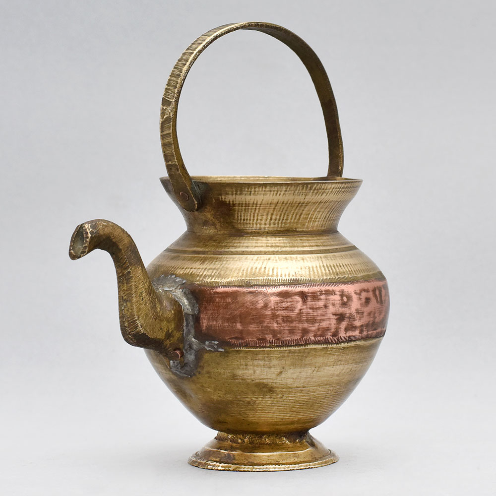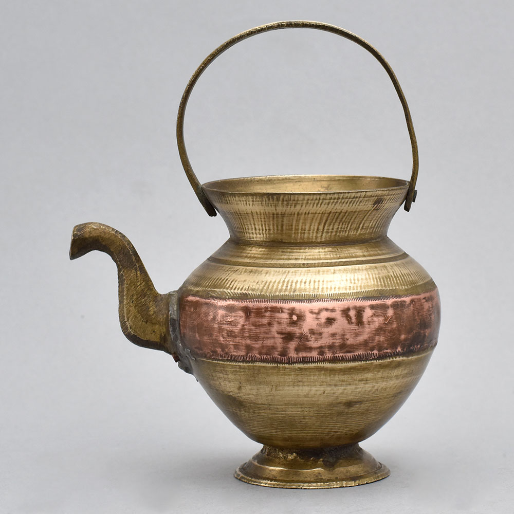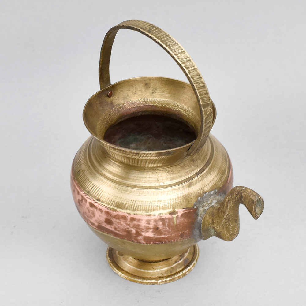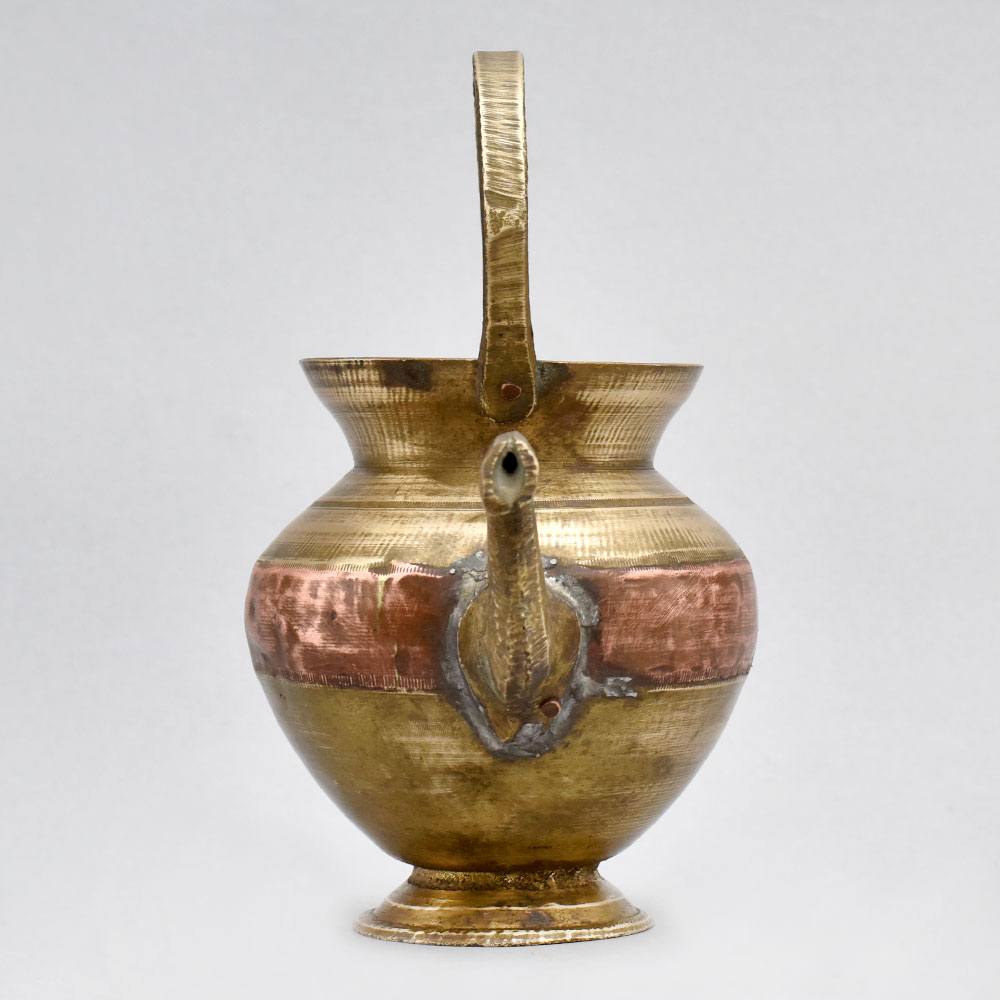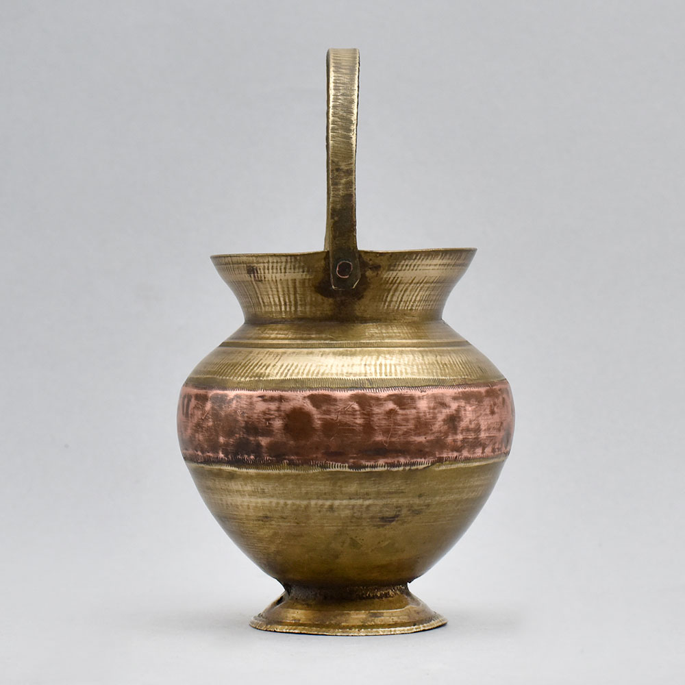 Bring the charm of ancient India into your home with this small, antique brass pot featuring a stunning copper inlay. Vintage, brass construction with intricate copper detailing Sturdy handle for easy carrying of holy water Broad base provides excellent stability Durable and visually striking This traditional Indian vessel was originally used to transport sacred water, but its timeless elegance makes it a captivating decorative accent. Display it proudly as a conversation piece or give it as a thoughtful housewarming gift that celebrates rich cultural heritage. The brass and copper materials ensure exceptional quality and longevity, while the intricate design adds a touch of refined sophistication. Embrace the beauty of Himalayan artistry and elevate your space with this exquisite piece. This unique handcrafted piece is a testament to traditional artistry, blending functionality with beauty and making it a treasured collectible for years to come.