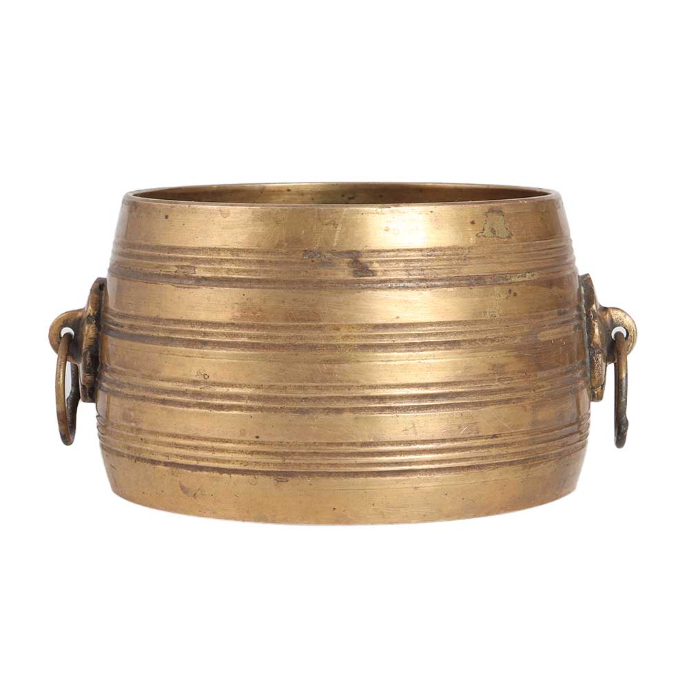 A small bowl for measuring rice made by professional Indian artisans from South India using ancient methods. It has a sturdy appearance with an antique brown finish. It has two handles engraved with flowers to make it easier to hold. Since ancient times, brass measurement bowls have been used in South Indian states to measure rice and grains before cooking. Buy this measuring bowl online from our website to get hassle-free delivery to your doorstep. It is made of high quality brass and will leave a long lasting impression on your home decor. A unique brass measuring bowl that you can gift to your family, friends or relatives on special, festive and auspicious occasions.
