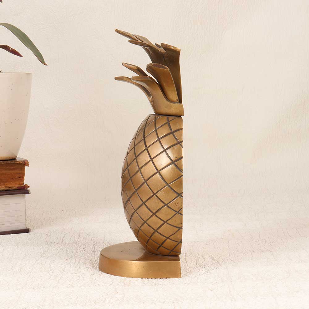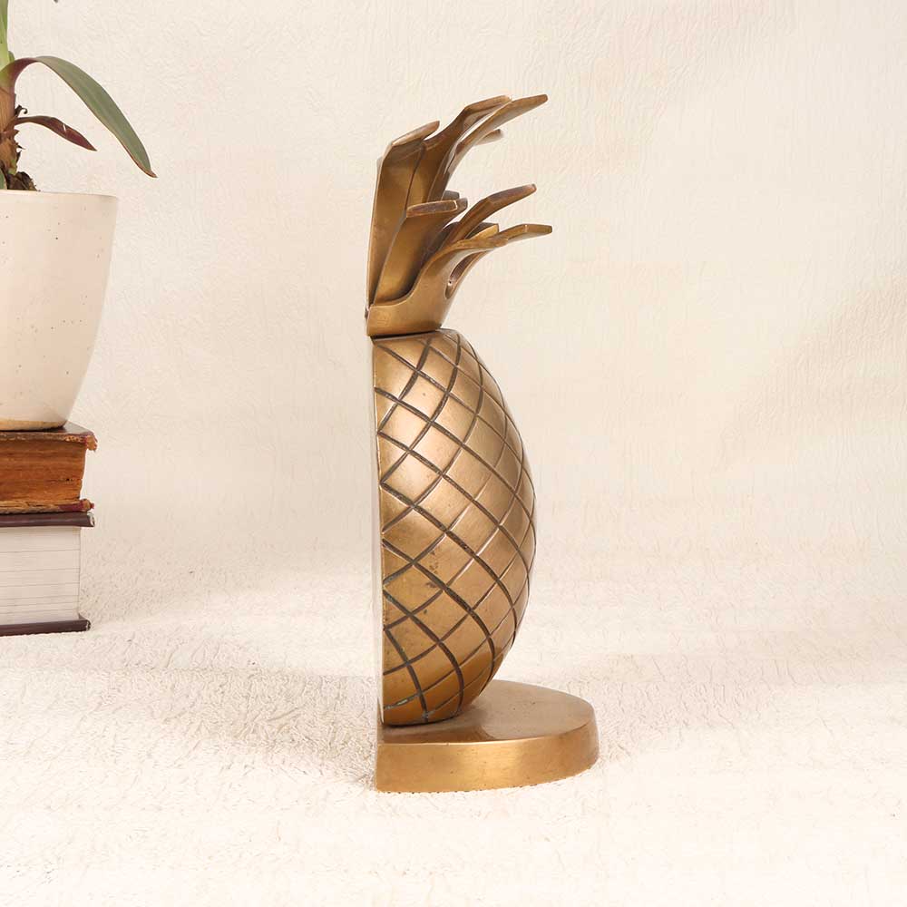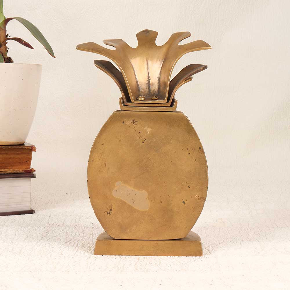 With its elegant patina finish and sculpted pineapple detailing, this vintage brass accent brings a refined touch of nostalgia and tropical flair to your home. The smooth, cool brass is a pleasure to handle, evoking the sophistication of a bygone era. Place this little pineapple on console tables, shelves, and mantles to infuse any space with vintage charm and subtle tropical inspiration. The compact size allows for artful arrangement without overpowering. For those seeking unique home decor that combines timeless aesthetics with a hint of playful nostalgia, this beautiful aged brass half pineapple is a sophisticated find. Display it alongside your favorite books, vases, and accents to create characterful vignettes brimming with old-world charm.