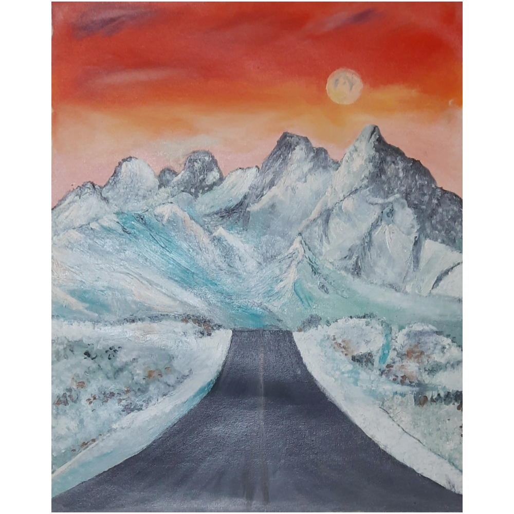 Step into a quiet winter dreamscape with Snow Road to the Mountains, an evocative Acrylic on Canvas painting by Artist Gayatri Sharma. Measuring 23 x 19 inches, this artwork captures a surreal scene where a solitary black road cuts through a snowy expanse, leading the eye toward towering ice-capped mountains under a fiery orange sunset sky.The contrast between the warm sky and the cool blue-white snow creates a dramatic visual experience that feels both still and powerful. The detailed brushwork and natural textures reflect the chill of winter while suggesting a sense of journey and solitude.This hand-painted piece adds a striking, contemplative touch to any interior—ideal for spaces that embrace nature, travel, or minimalism.